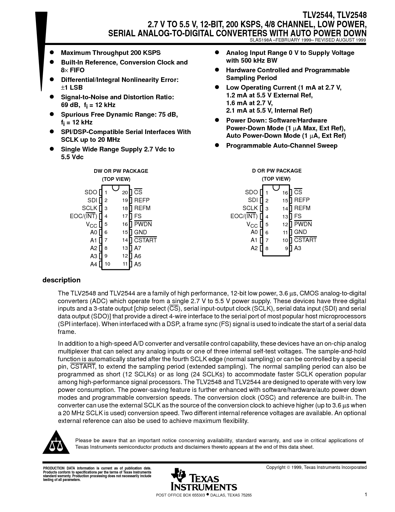 2.7 V TO 5.5 V, 12-BIT, 200 KSPS, 4/8 CHANNEL, LOW POWER, SERIAL ANALOG-TO-DIGITAL CONVERTERS WITH AUTO POWER DOWN