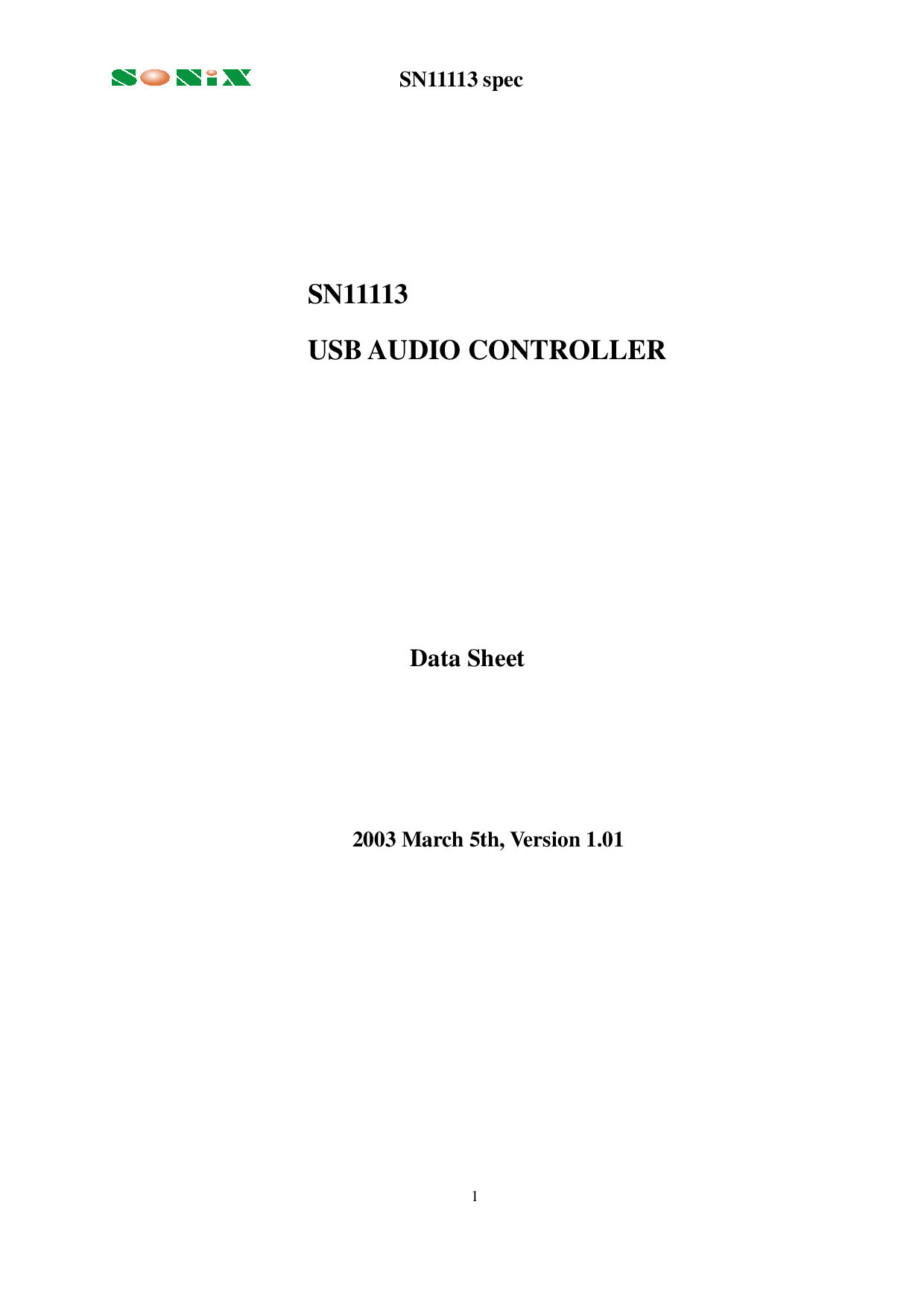 sn11113 规格 1 sn11113 usb 音频 控制器 数据 工作表 2003 march 5th, 版本 1.01 | |
