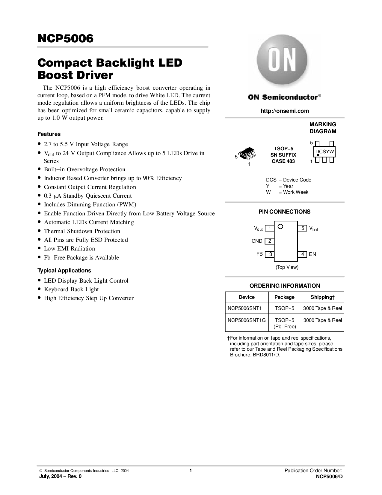 NCP5006SNT1 TSOP−5 3000 t猿 &放大器; 卷轴