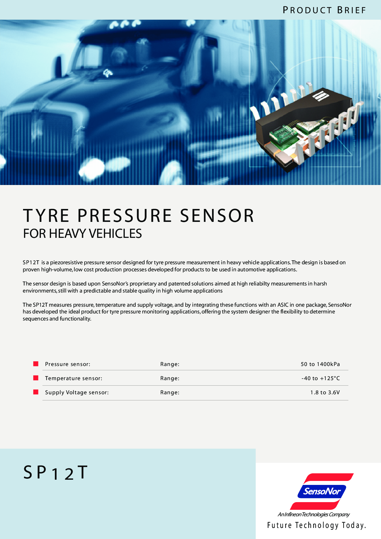 SP12T是 一个 piezoresistive 压力 传感器 设计 用于 tyre 压力 测量 入点 重型 车辆 应用程序. 这 设计 是 基于 开启