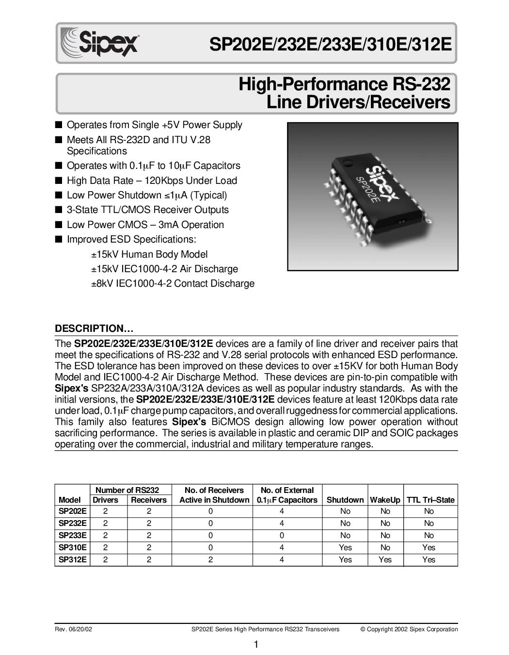 rev. 06/20/02 sp202e 系列 高 业绩 rs232 收发器 © 版权 2002 sipex 公司