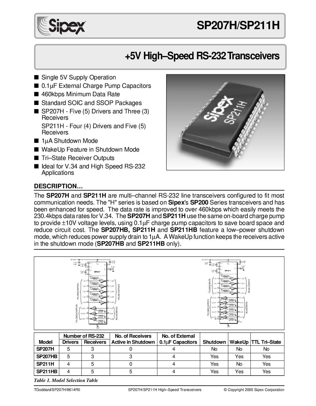 tgoddard/sp207h/9614r0 sp207h/sp211h 高速 收发器 © 版权 2000 sipex 公司