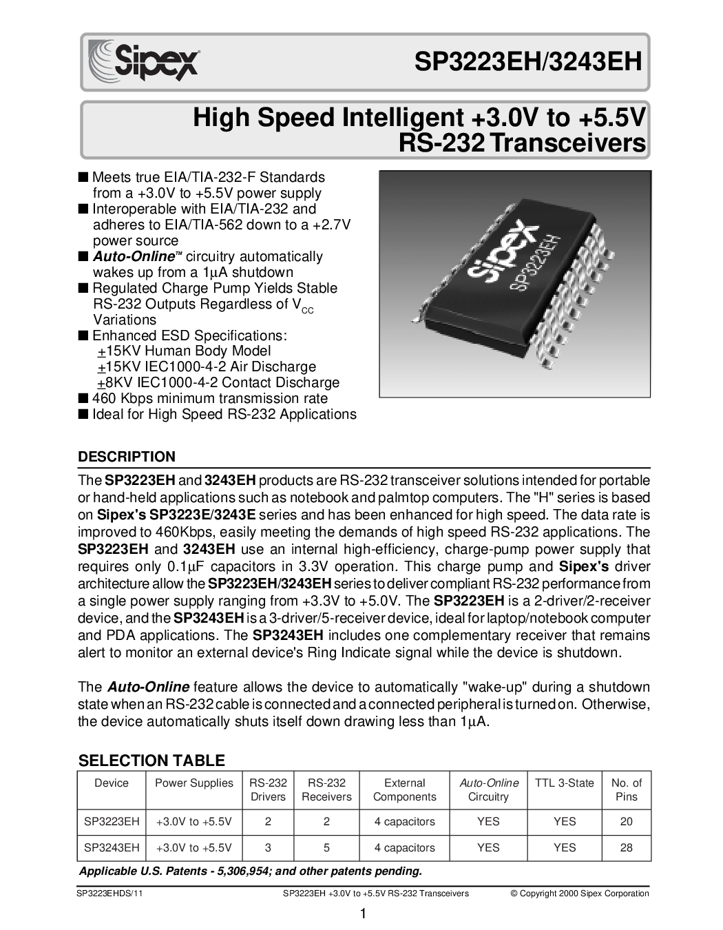 sp3223ehds/11 sp3223eh +3.0v 至 +5.5v rs-232 收发器 © 版权 2000 sipex 公司