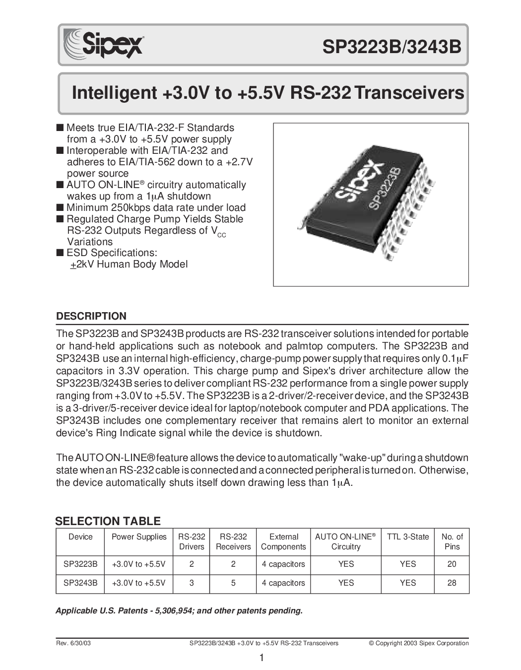 rev. 6/30/03 sp3223b/3243b +3.0v 至 +5.5v rs-232 收发器 © 版权 2003 sipex 公司