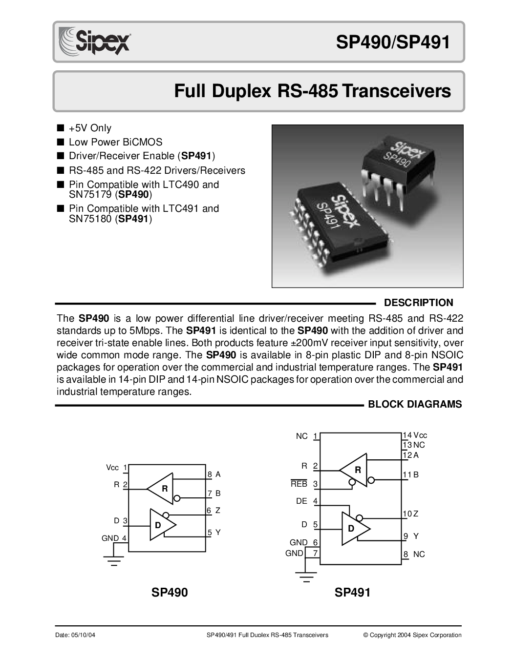 日期: 05/10/04 sp490/491 已满 双工 rs-485 收发器 © 版权 2004 sipex 公司