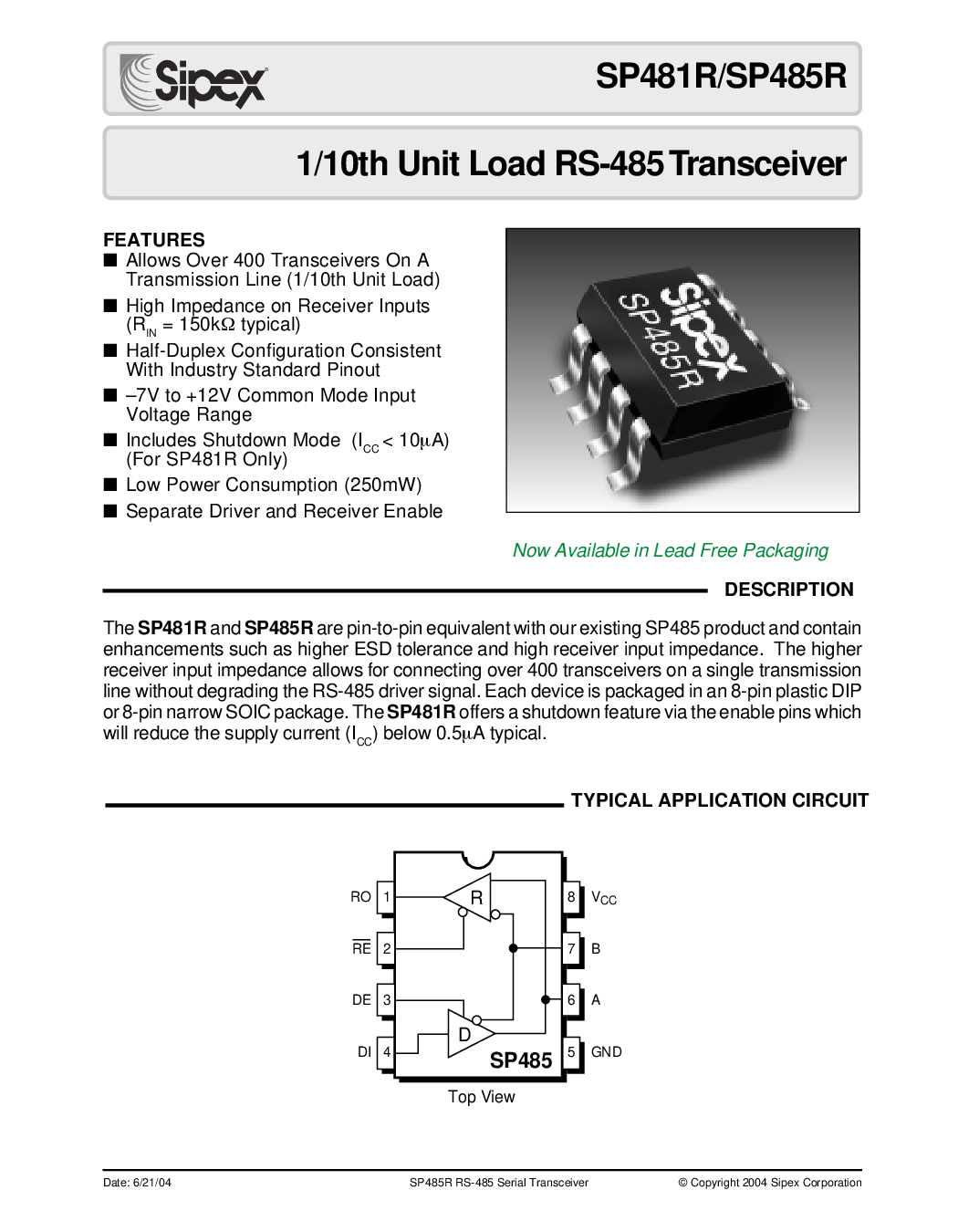 日期: 6/21/04 sp485r rs-485 串行 收发器 © 版权 2004 sipex 公司