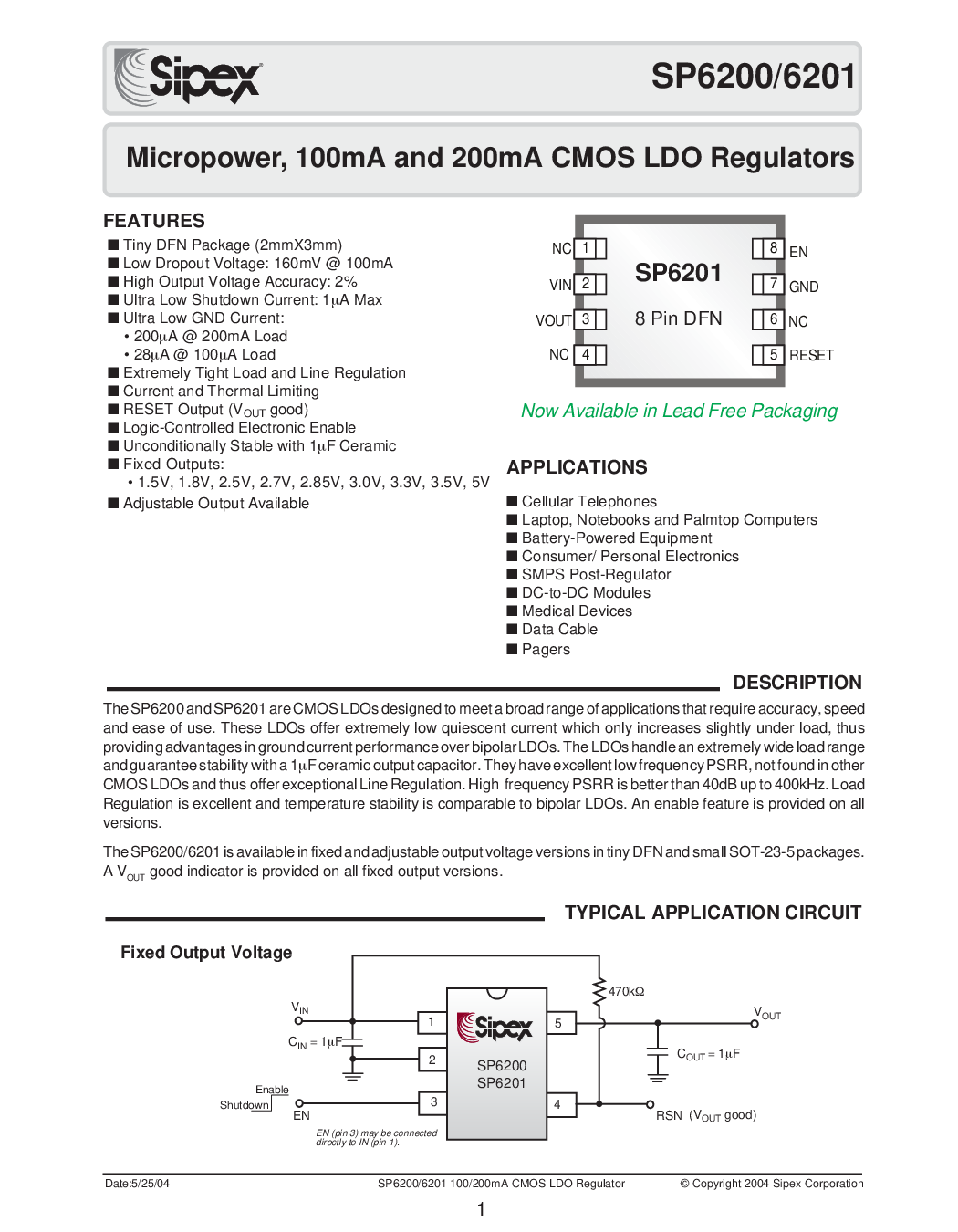 日期:5/25/04 sp6200/6201 100/200ma cmos ldo 调节器 © 版权 2004 sipex 公司