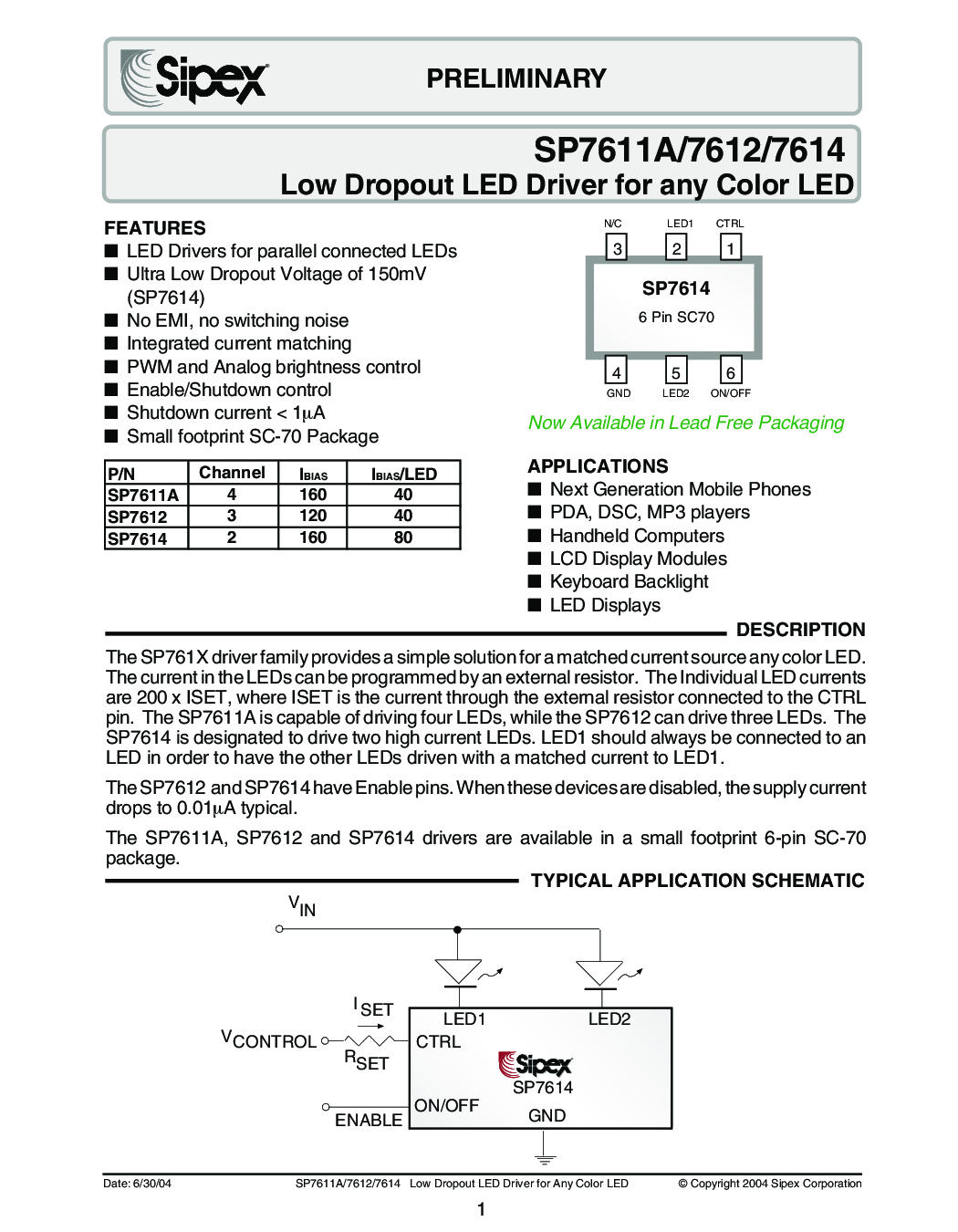 日期: 6/30/04 sp7611a/7612/7614 低 辍学 led指示灯 驾驶员 用于 任何 颜色 led指示灯 © 版权 2004 sipex 公司