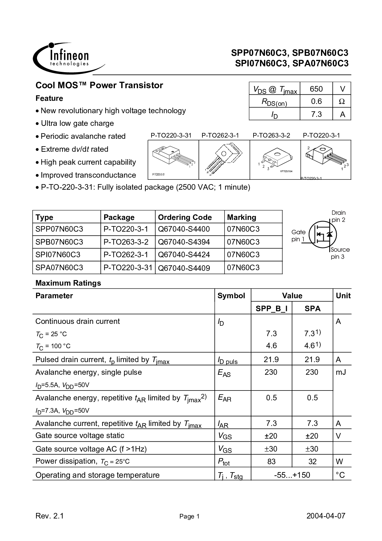 SPP07N60C3 p-to220-3-1 q67040-s4400