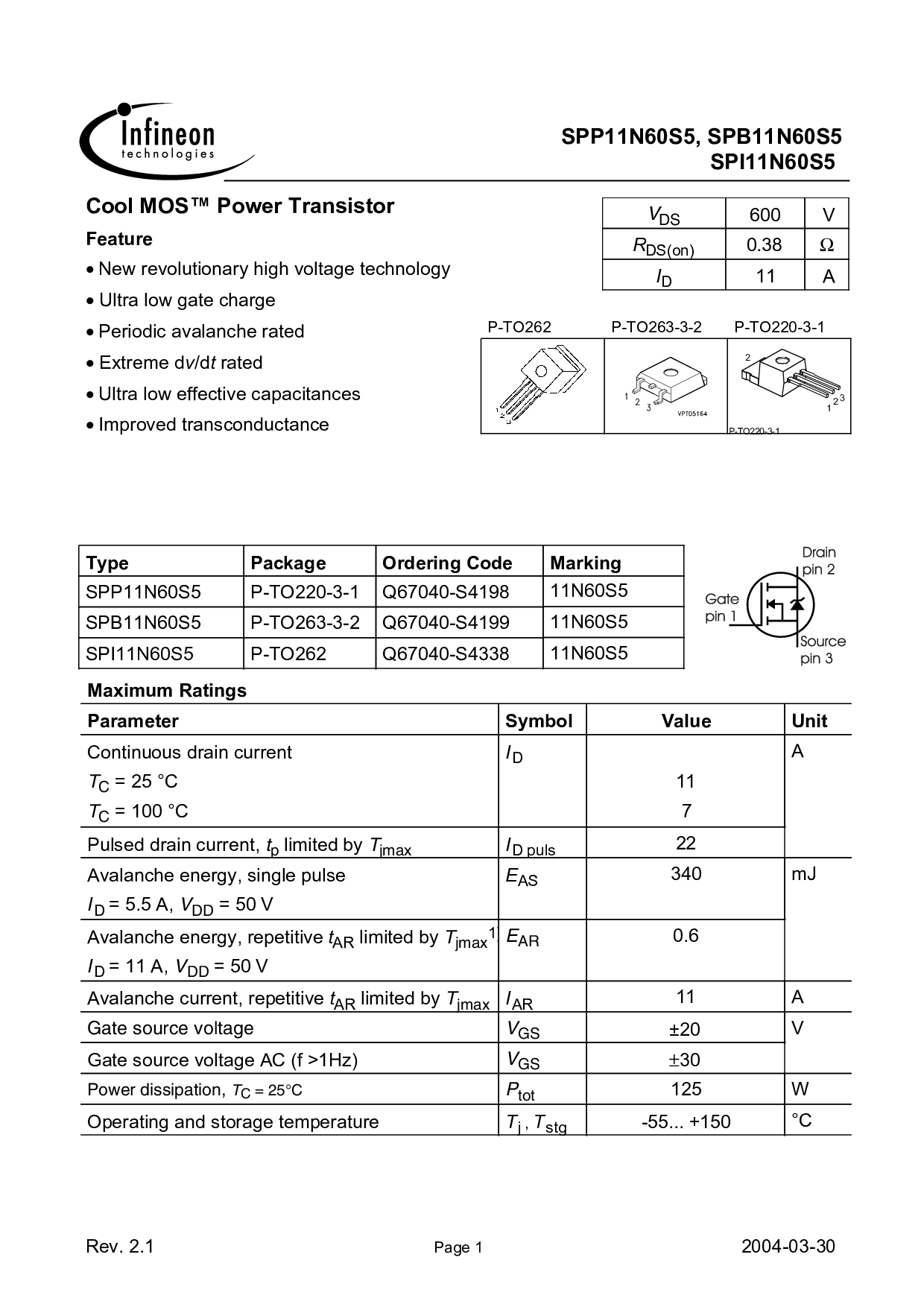 SPP11N60S5 p-to220-3-1 q67040-s4198