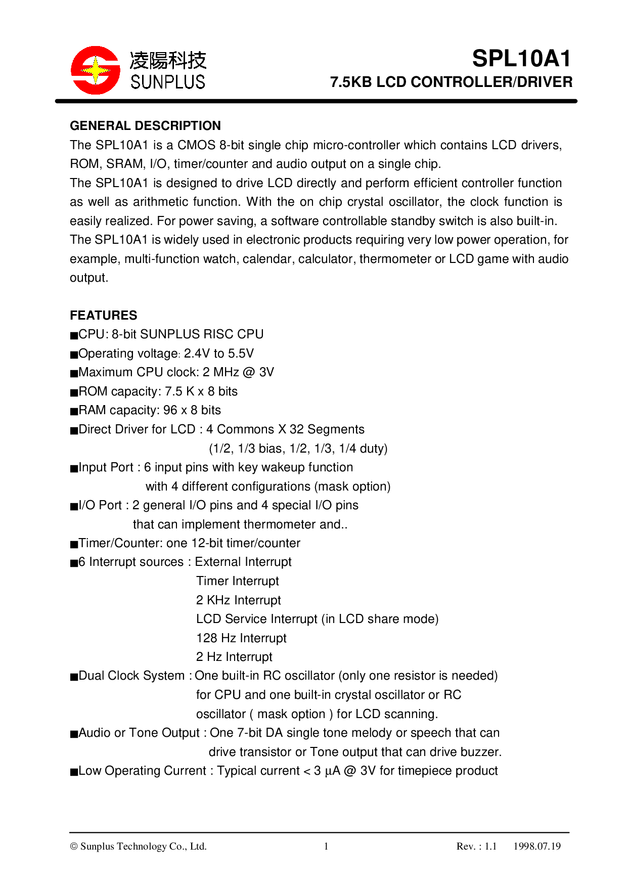 sunplus 技术 一氧化碳., 有限公司. 1 rev. : 1.1 1998.07.19