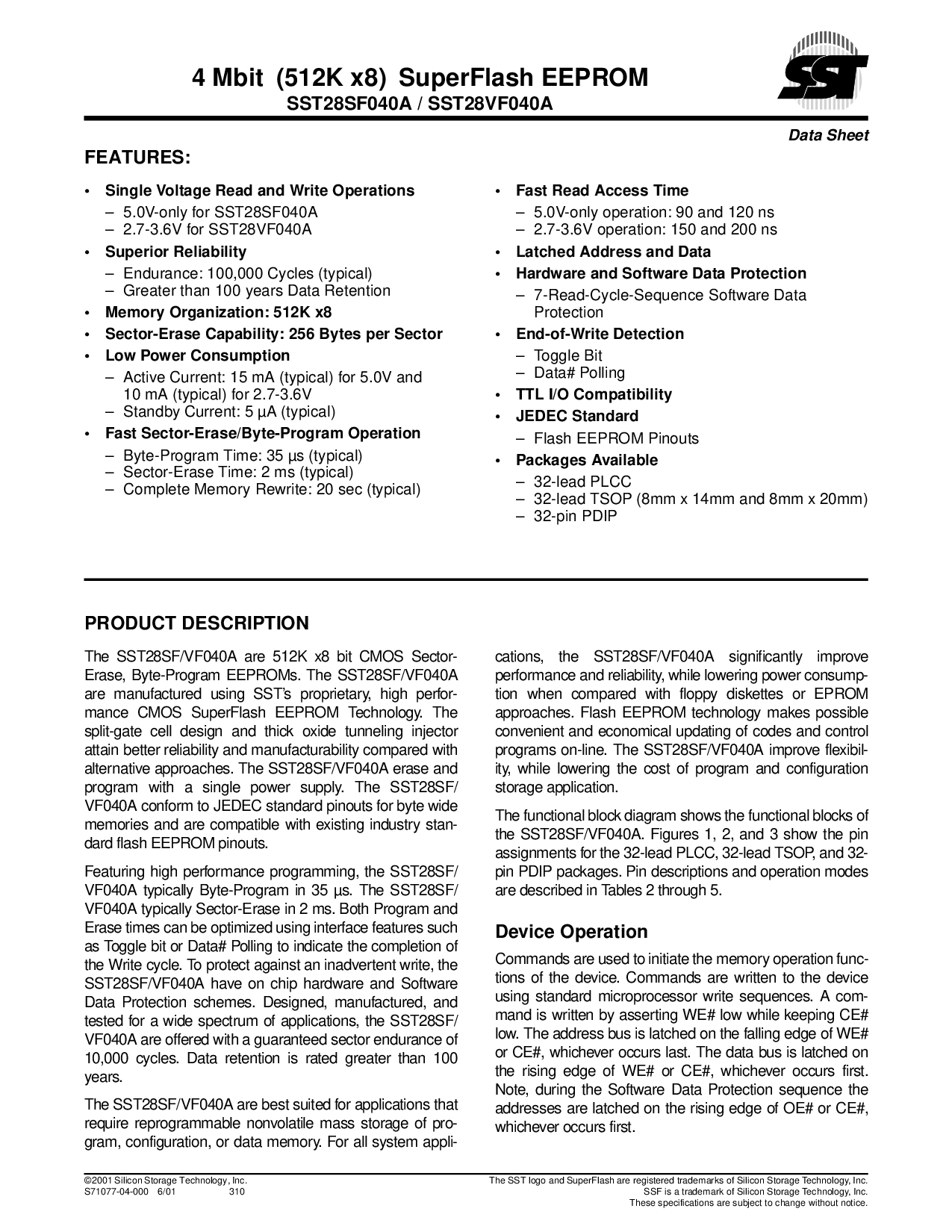 浏览型号SST28VF040A-90-4I-PH的Datasheet PDF文件第2页