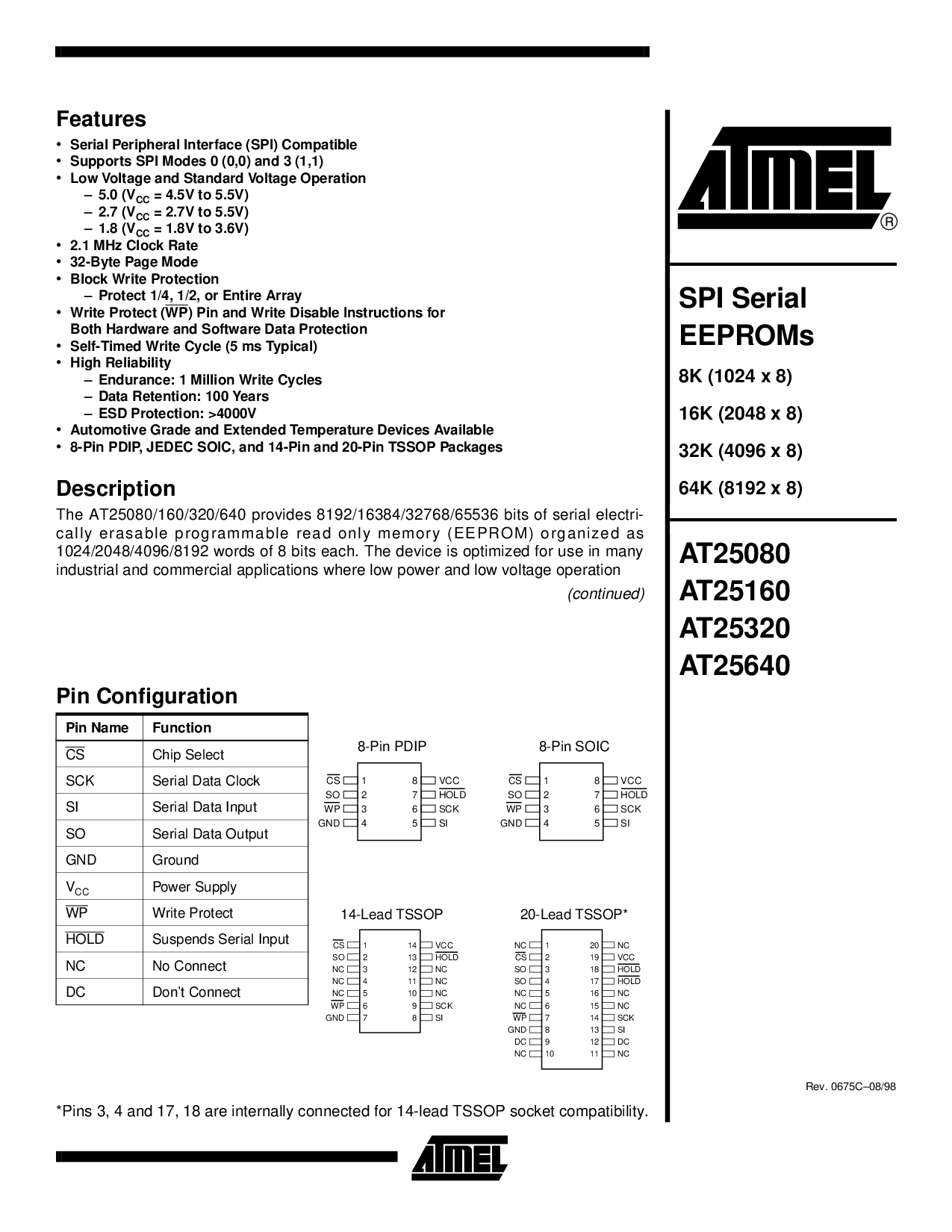 这 at25080/160/320/640 提供 8192/16384/32768/65536 比特 的 串行 电子-