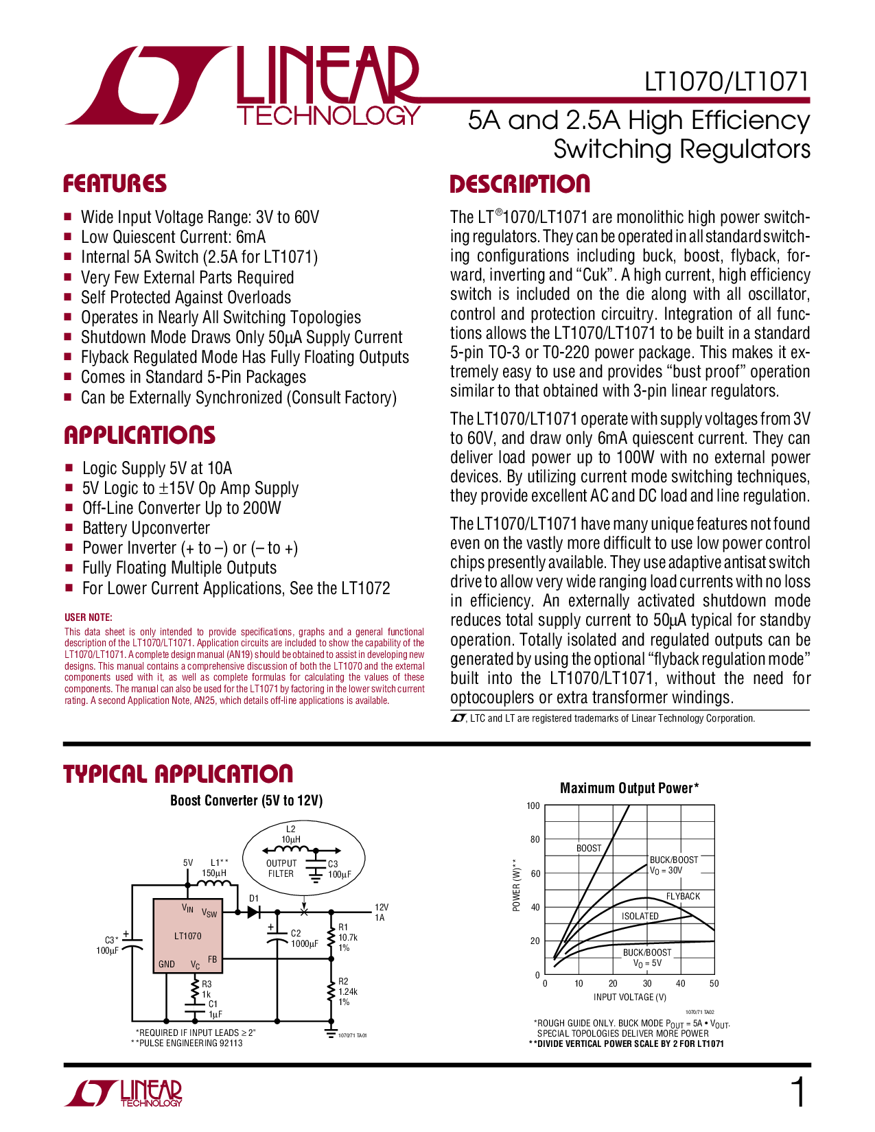 内部 5a 开关 (2.5a 用于 lt1071)