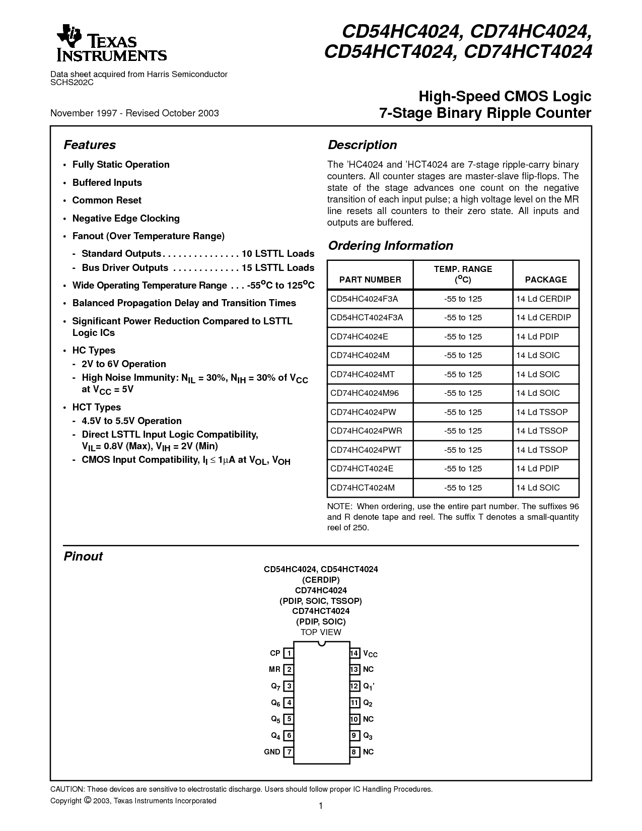 CD54HCT4024F3A -55 至 125 14 ld cerdip