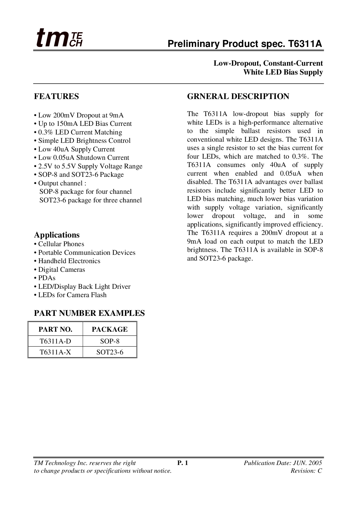 初步 产品 规格. t6311a