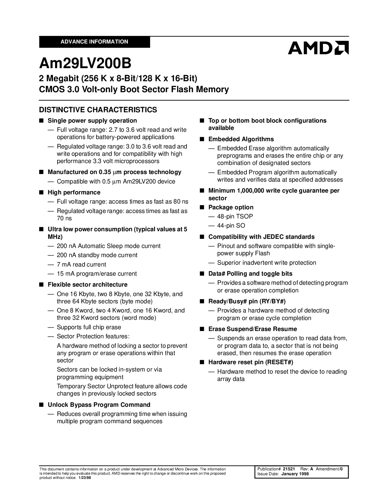 2 Megabit (256 K x 8-Bit/128 K x 16-Bit) CMOS 3.0 Volt-only Boot Sector Flash Memory