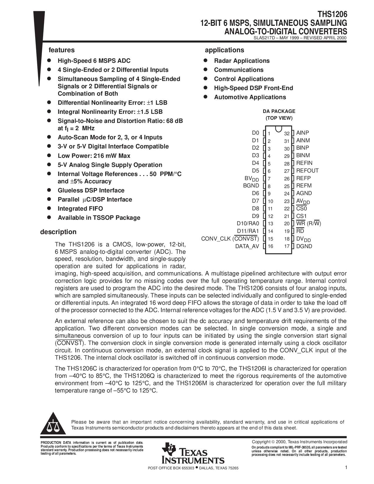 寄存器 是 已使用 至 程序 这 adc 进入 这 需要 模式. 这 ths1206 由 的 四 模拟 输入,