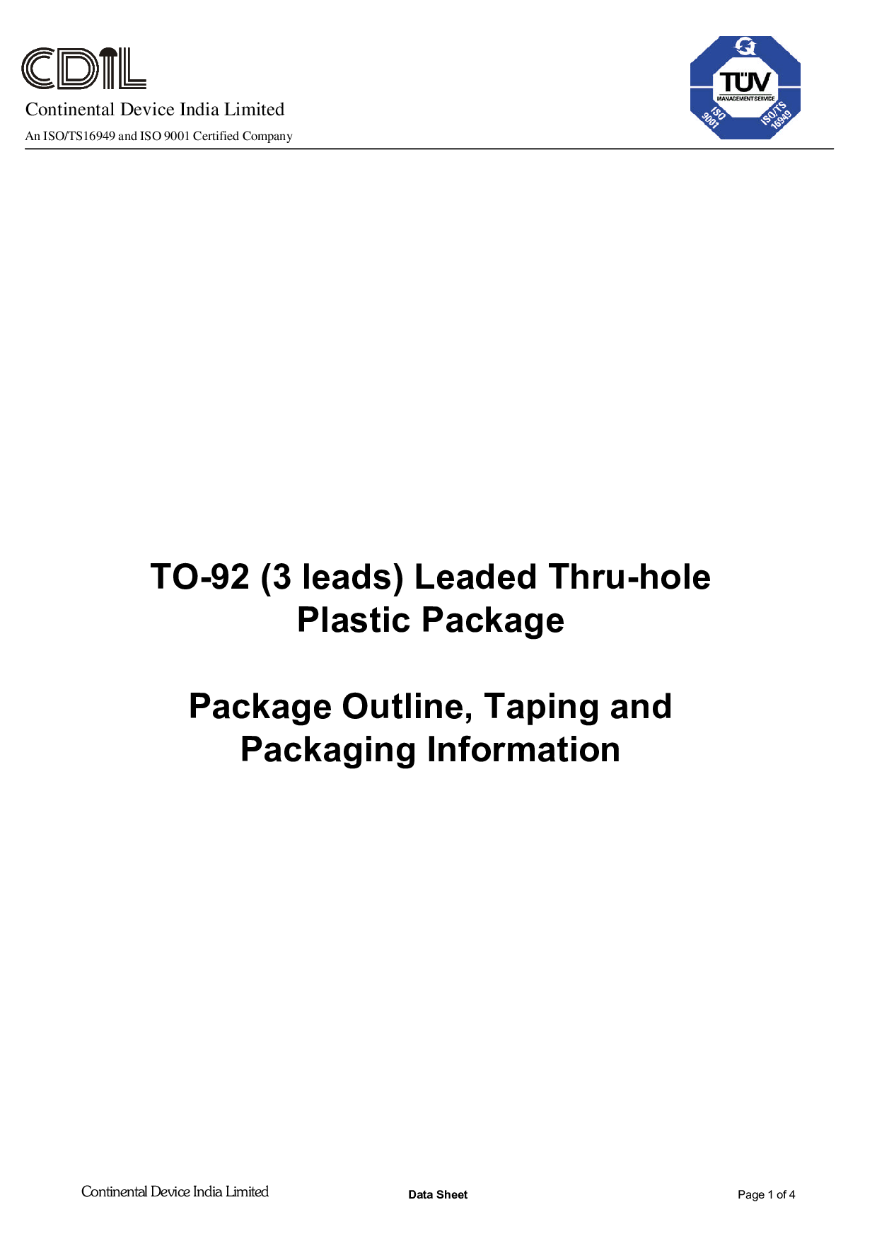 至-92 (3 导联) 含铅 通孔 塑料 包装 包装 大纲, 录音 和 包装 信息 continental 设备 印度 有限 数据 工作表 第页 1 的 4 continental 设备 印度 有限 一个 iso/ts16949 和 iso 9001 已认证 公司 | |