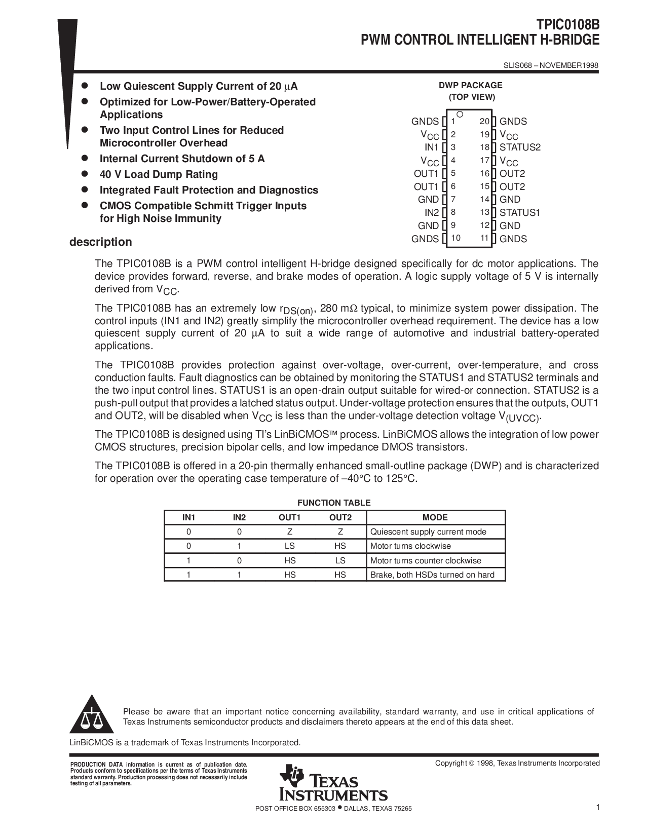 这 tpic0108b 是 一个 pwm 控制 智能 h-桥梁 设计 具体而言 用于 直流 电机 应用程序. 这