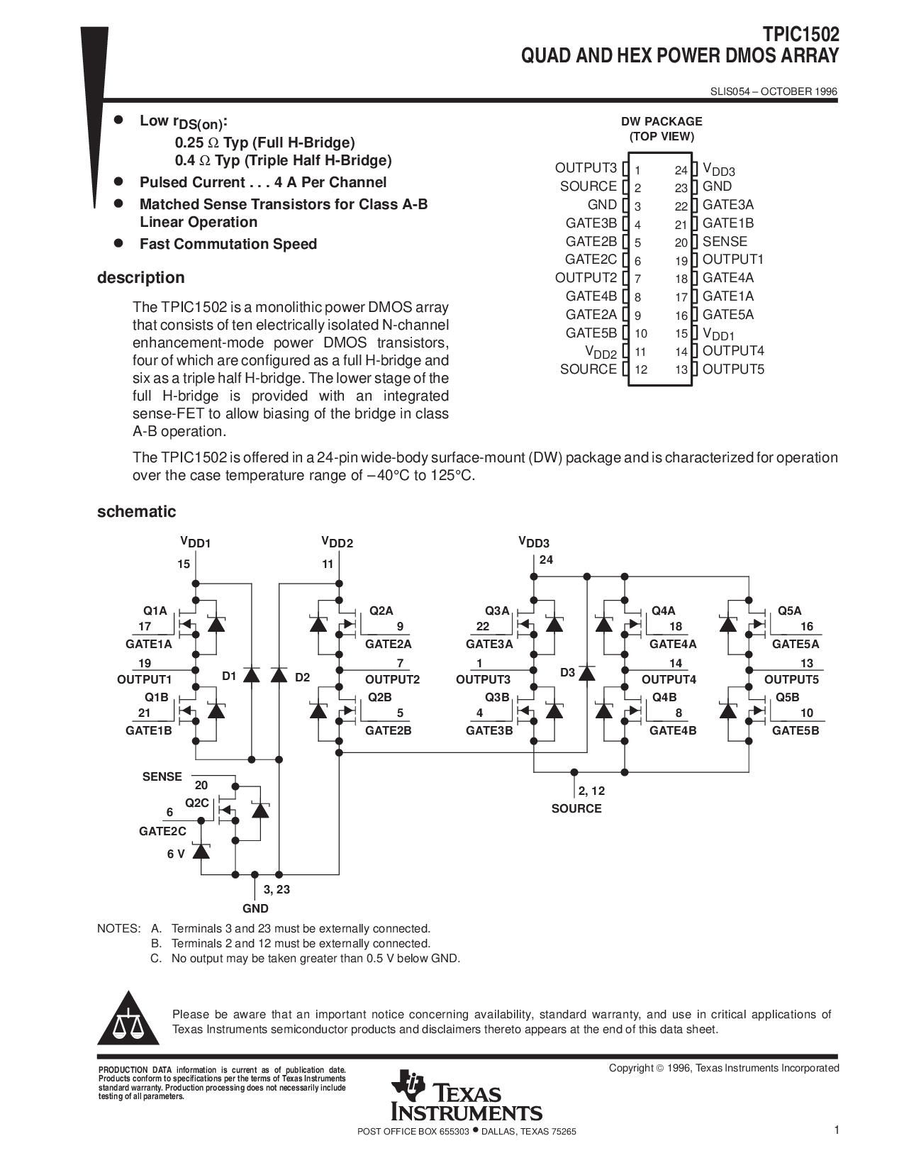 这 tpic1502 是 提供 入点 一个 24-管脚 宽-车身 表面贴装 (dw) 包装 和 是 表征 用于 操作