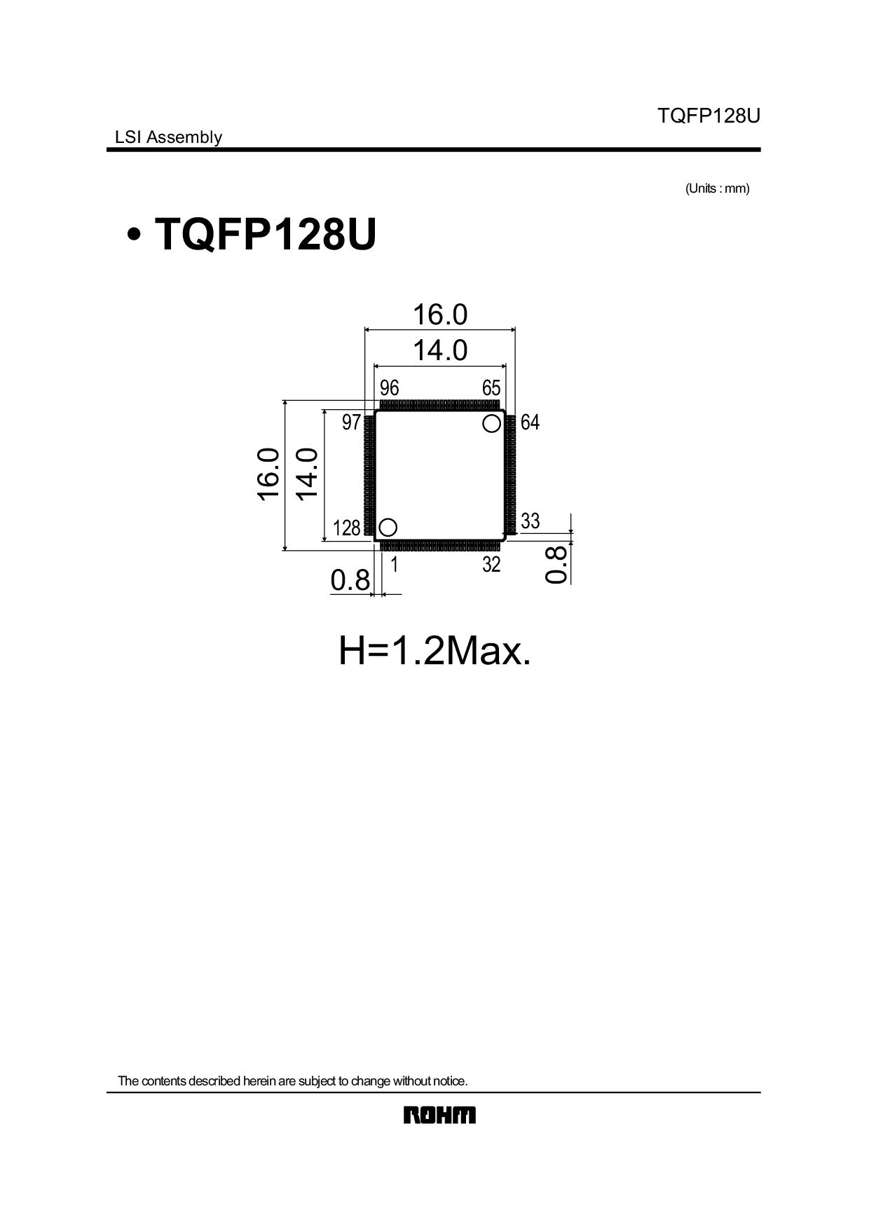 TQFP128U • tqfp128u lsi 总成 (单位 : mm) 这 内容 已描述 此处 是 主题 至 变更 无 通知. h=1.2max. 1 128 14.0 16.0 97 96 14.0 16.0 32 33 64 65 0.8 0.8 | |