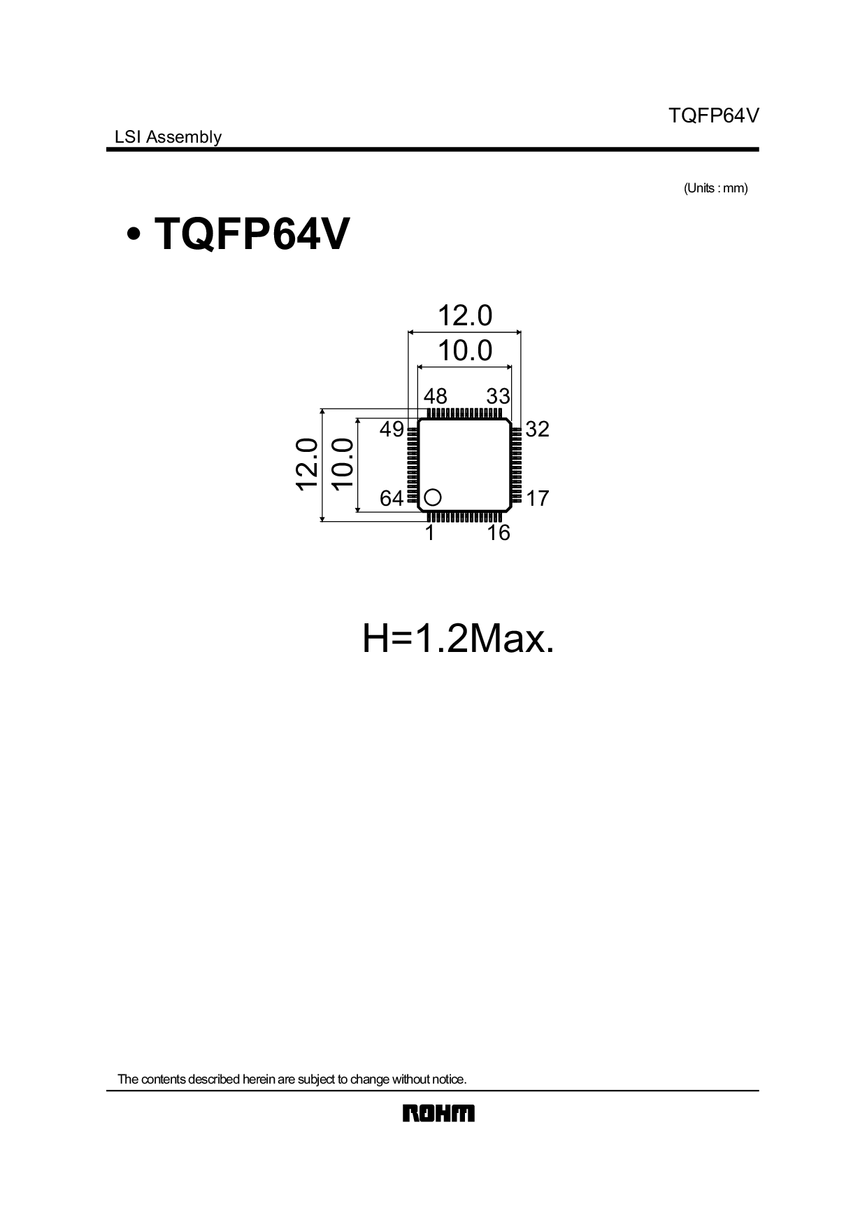 TQFP64V • tqfp64v lsi 总成 (单位 : mm) 这 内容 已描述 此处 是 主题 至 变更 无 通知. h=1.2max. 3348 161 12.0 10.0 49 64 32 17 10.0 12.0 | |