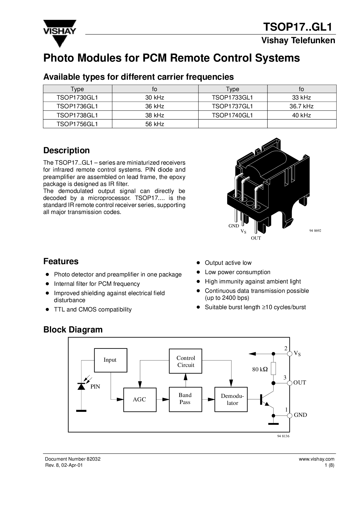 TSOP1730GL1 30 khz TSOP1733GL1 33 khz