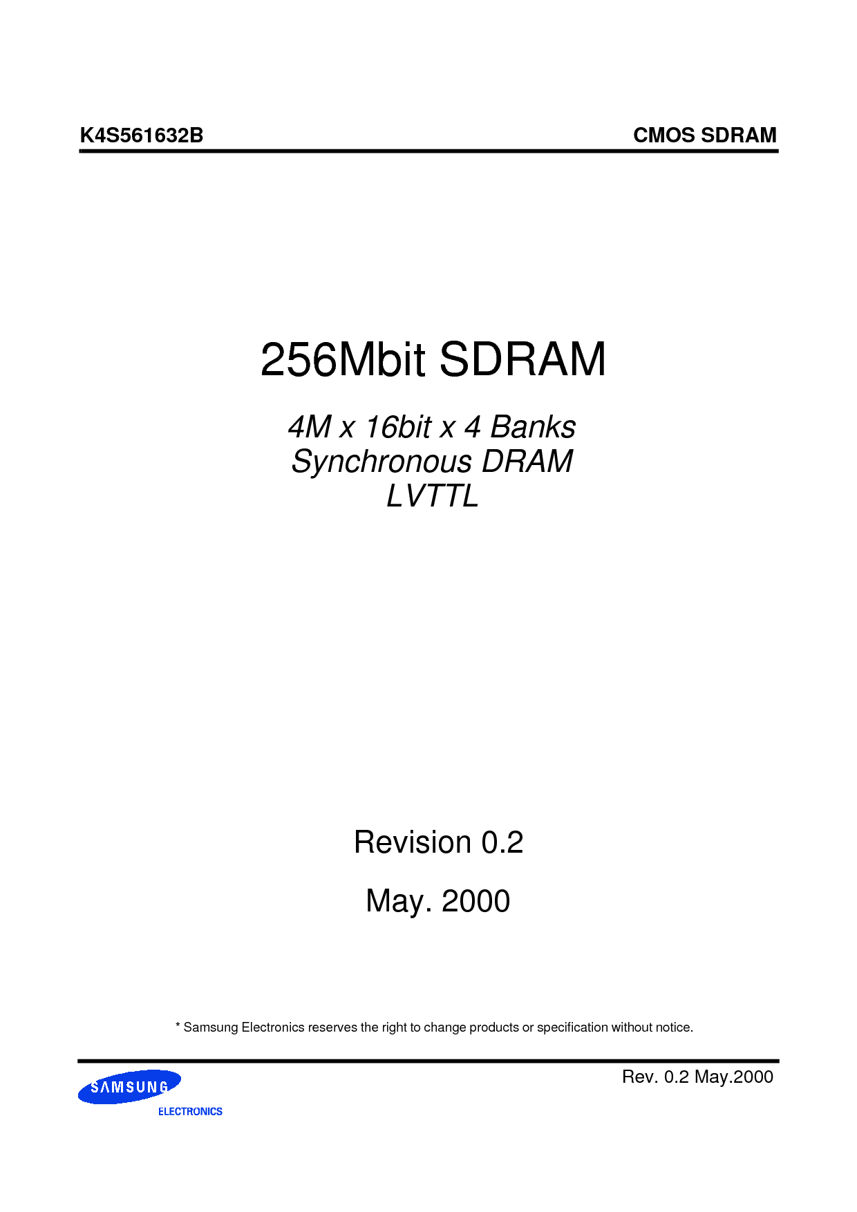 K4S561632B cmos sdram rev. 0.2 将.2000 256mbit sdram 4m x 16bit x 4 银行 同步 dram LVTTL 修订 0.2 将. 2000 * samsung 电子产品 储备金 这 右侧 至 变更 产品 或 规格 无 通知. | |