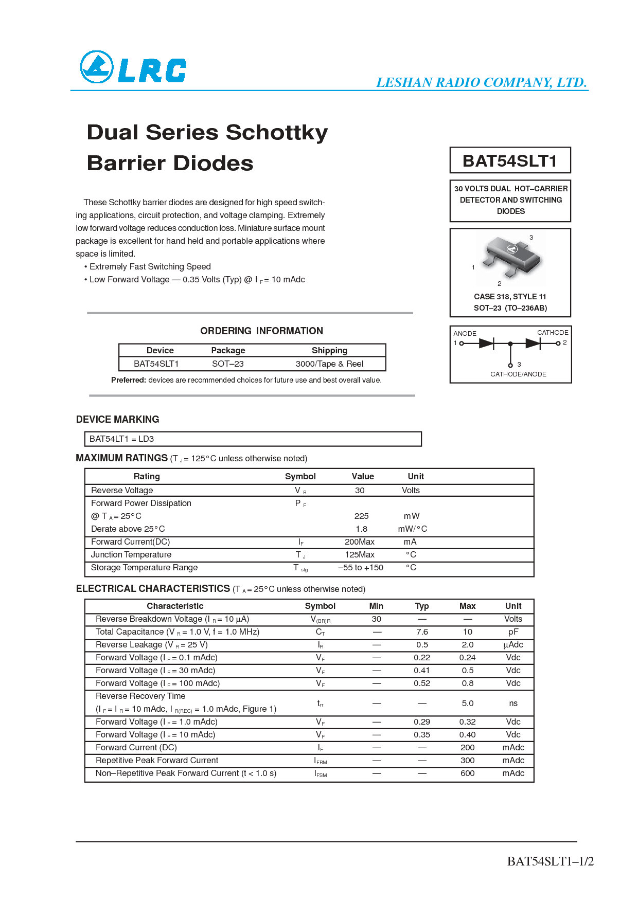 浏览型号BAT54SLT1的Datasheet PDF文件第2页