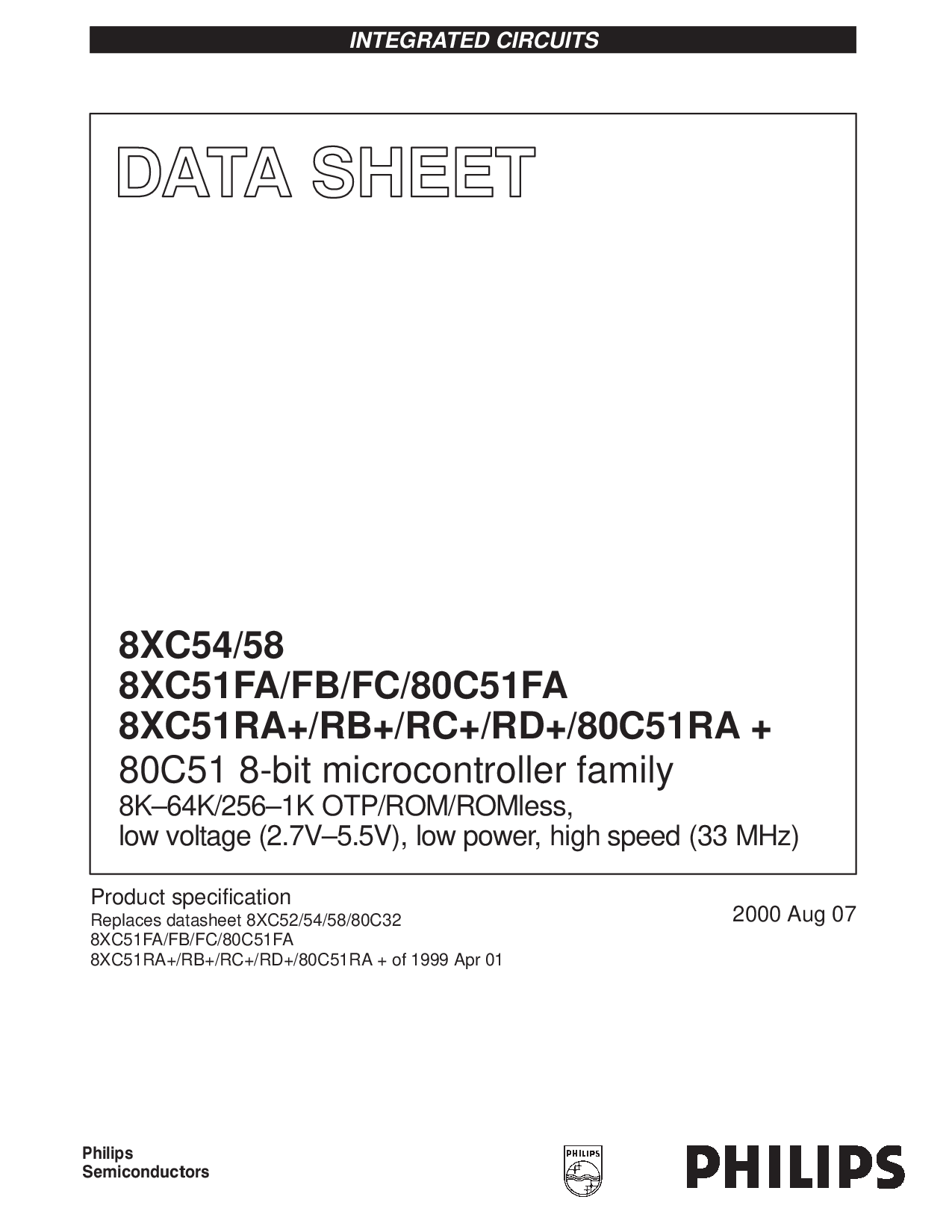 80C51 8-bit microcontroller family 8K.64K/256.1K OTP/ROM/ROMless, low voltage 2.7V.5.5V, low power, high speed 33 MHz