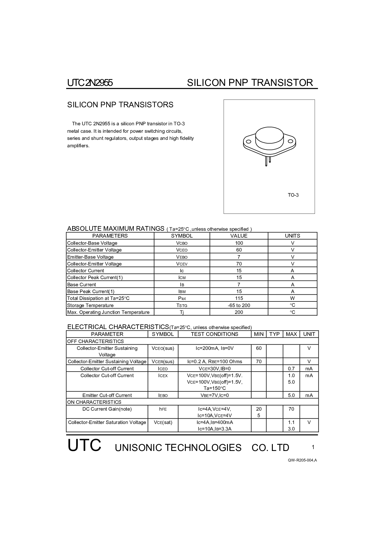 这 utc 2n2955 是 一个 硅 pnp 晶体管 入点 至-3