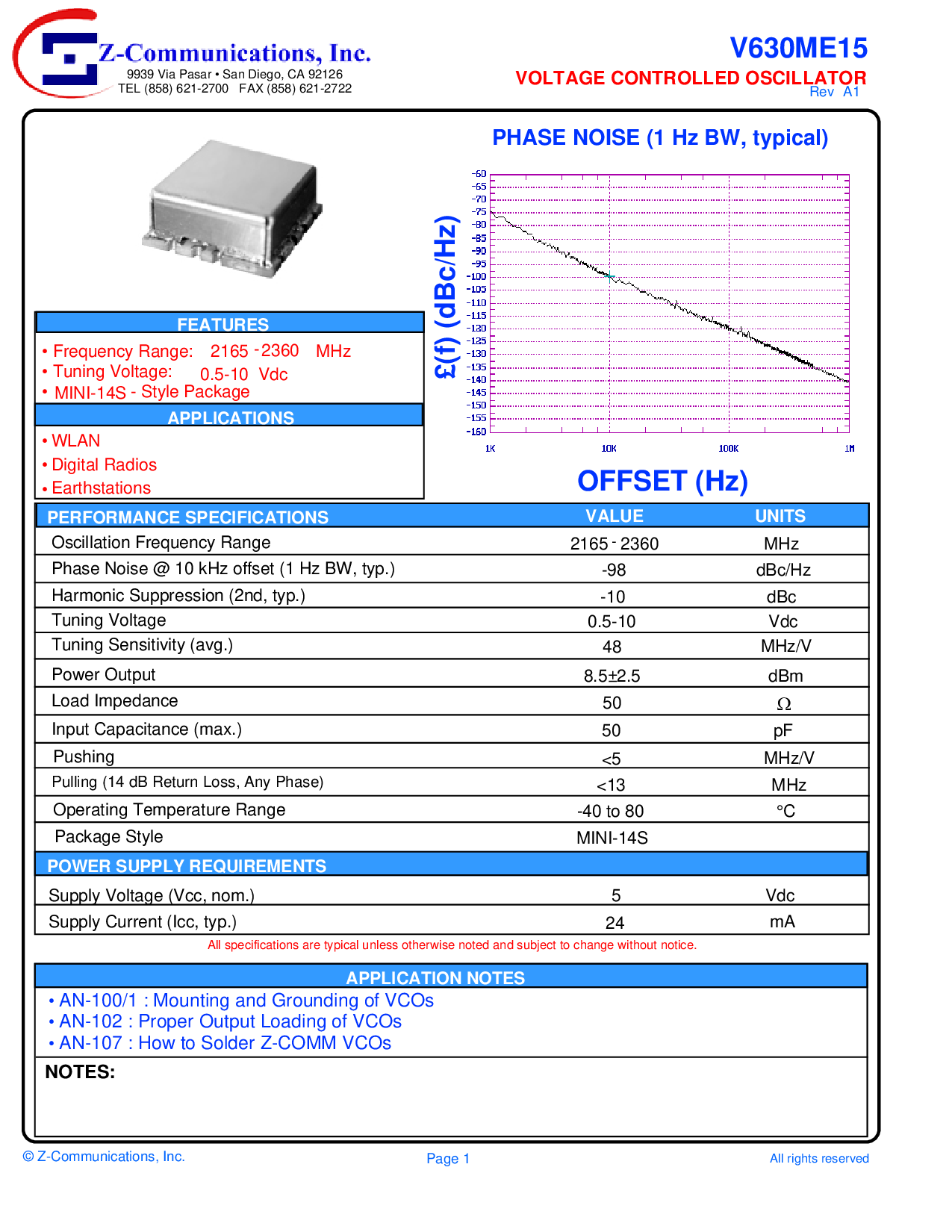 相位 噪声 @ 10 khz 偏移量 (1 赫兹 bw, 典型值.)