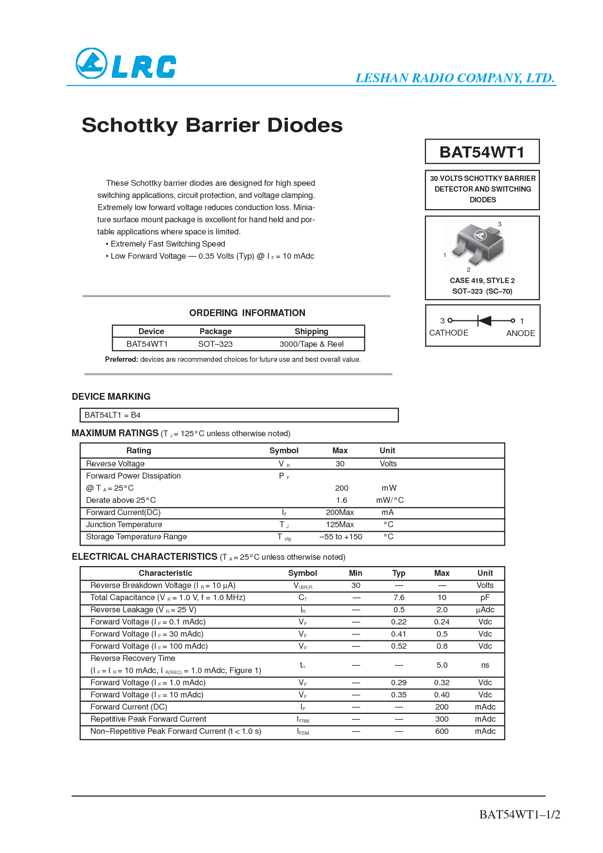 BAT54WT1 SOT–323 3000/胶带 &放大器; 卷轴