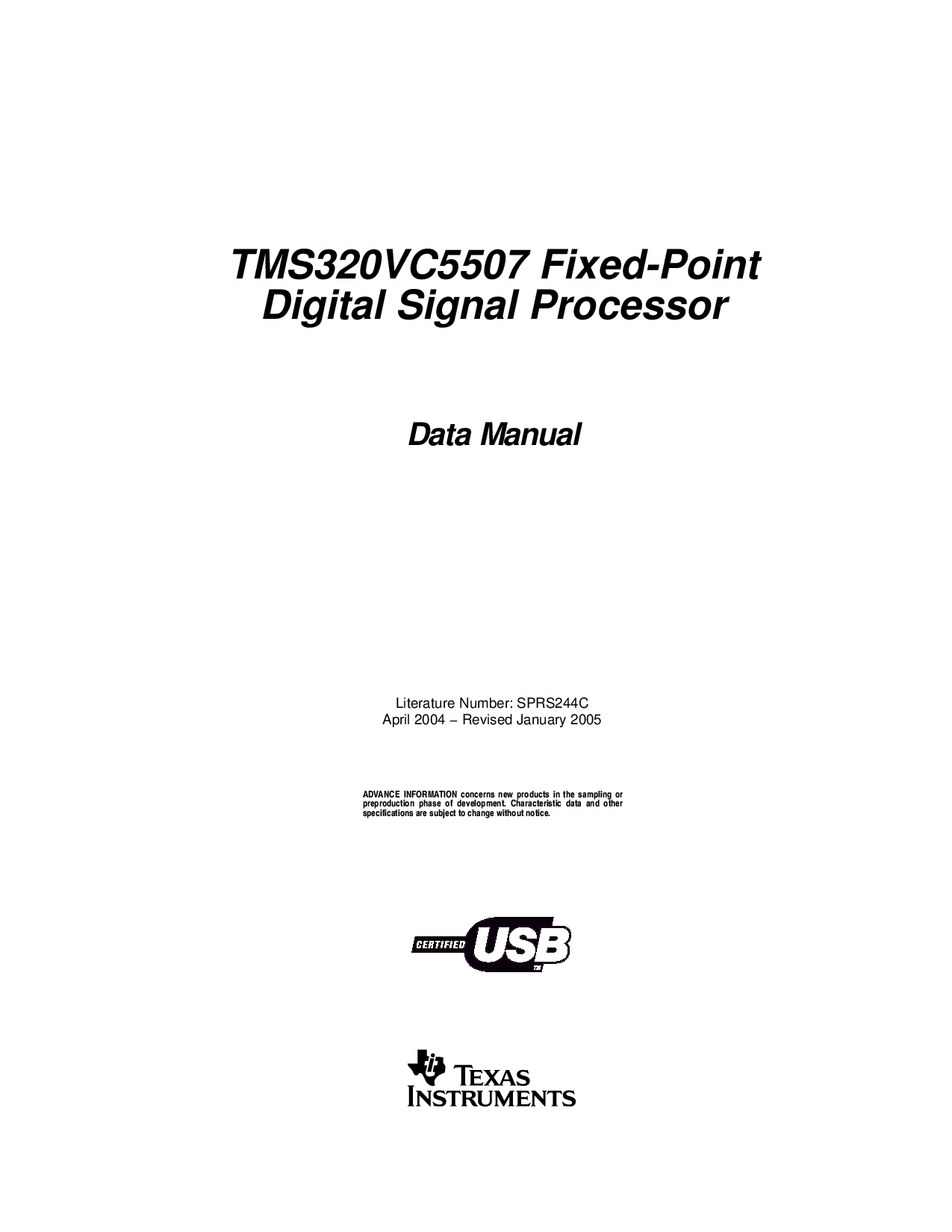 tms320vc5507 定点 数字 信号 处理器 数据手册 文学 号码: sprs244c april 2004 − 修订 january 2005 预付款 信息 关注事项 新建 产品 入点 这 取样 或 预生产 相位 的 发展. 特性 数据 和 其他 规格 是 主题 至 变更 无 通知. | |