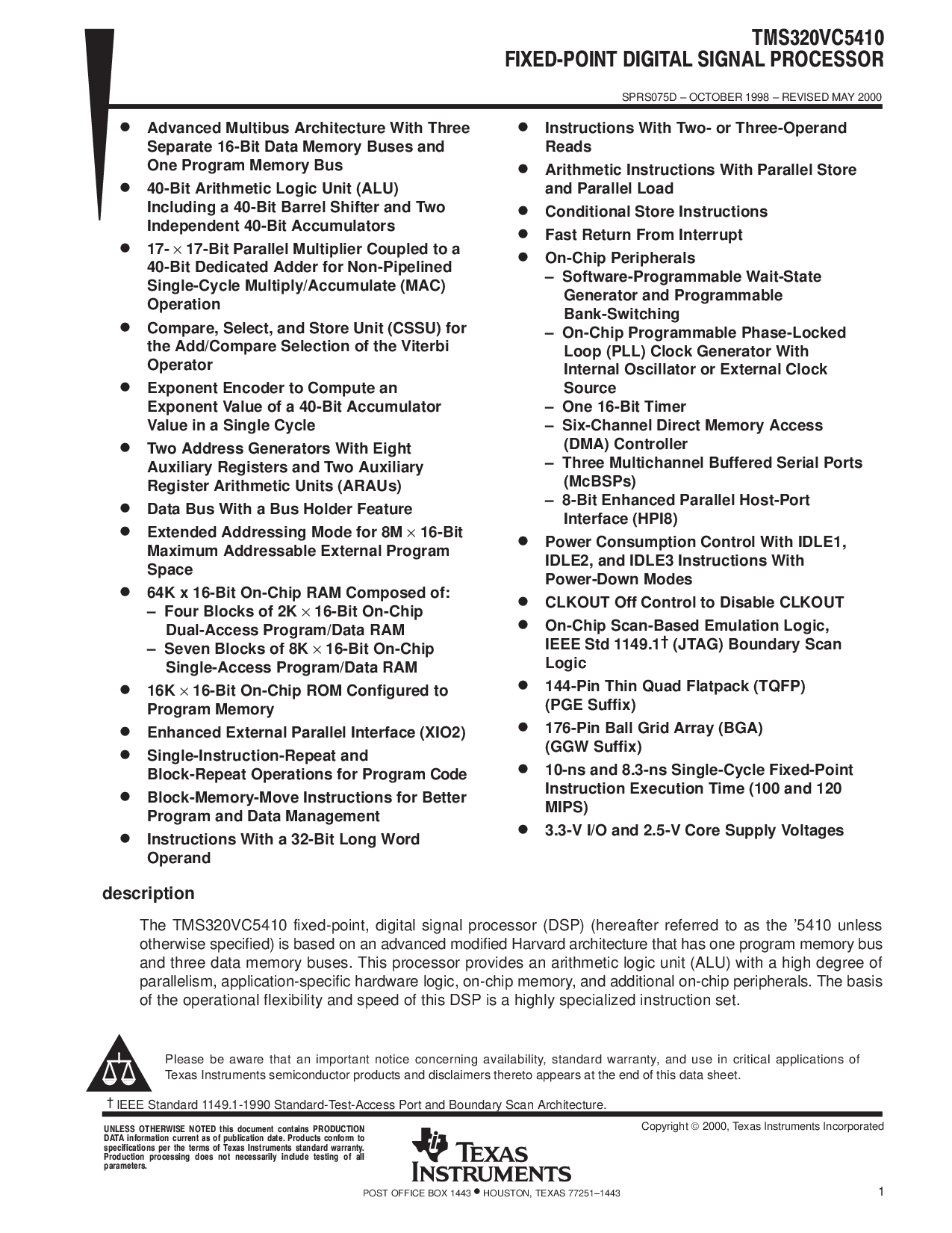 这 tms320vc5410 固定-点, 数字 信号 处理器 (dsp) (此后 参考 至 作为 这 ’5410 除非