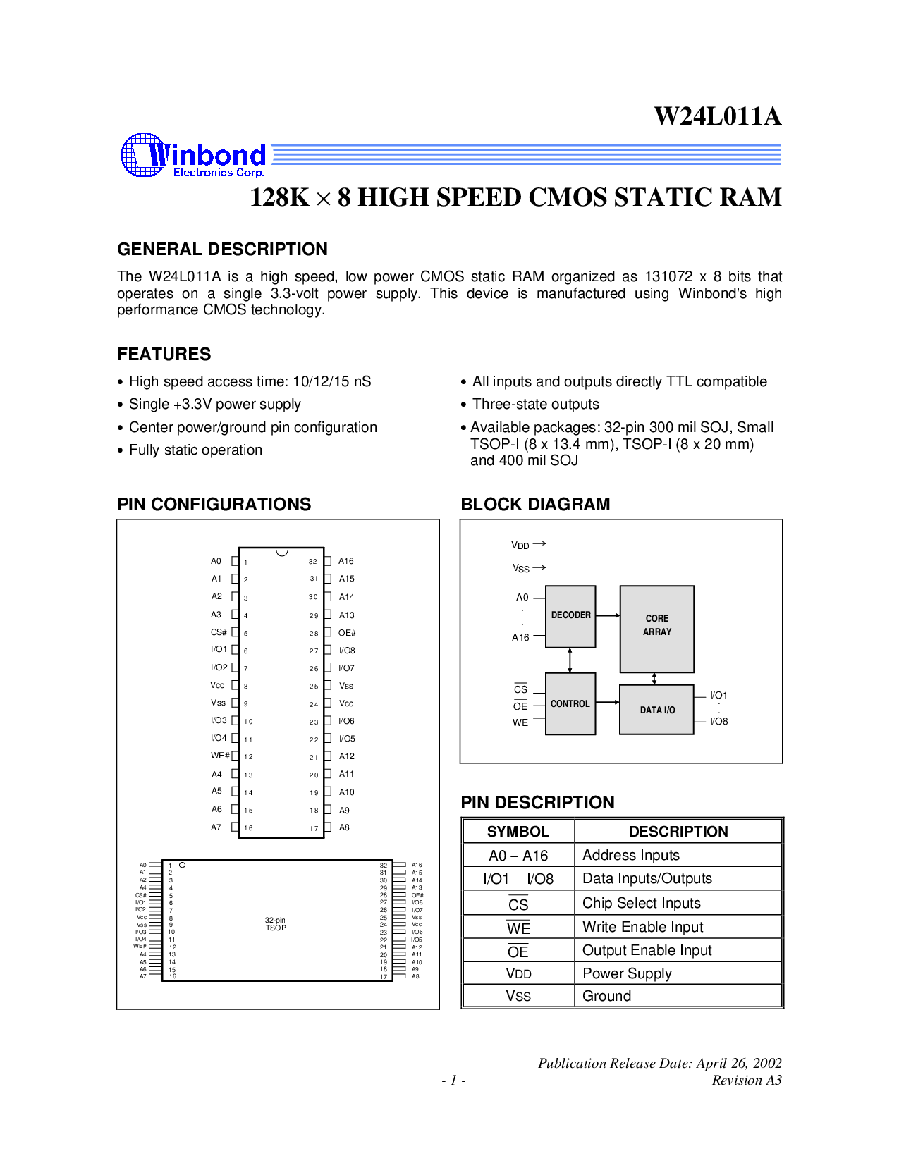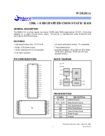 这w24l011a 是 一个 高 速度, 低 电源 cmos 静态 ram 有组织的 作为 131072 x 8 比特 那