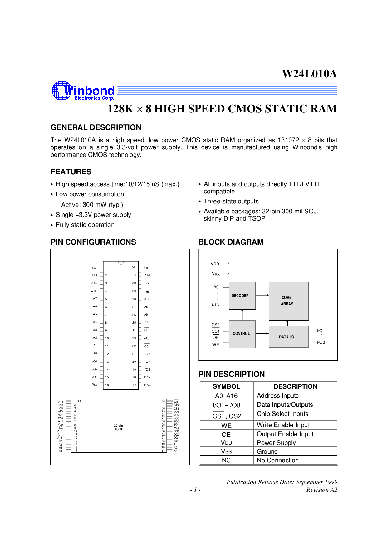 这 w24l010a 是 一个 高 速度, 低 电源 cmos 静态 ram 有组织的 作为 131072