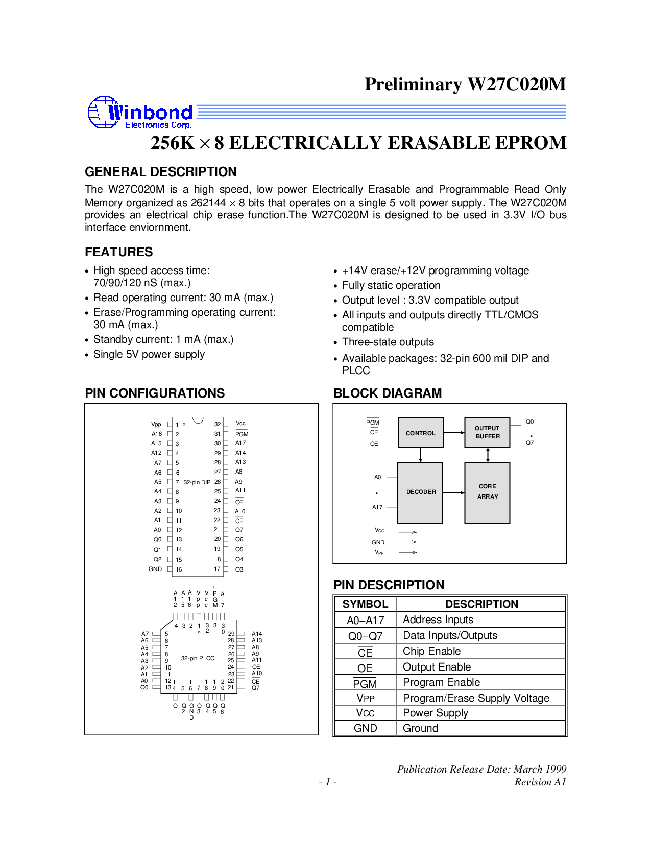 这 w27c020m 是 一个 高 速度, 低 电源 电气 可擦除 和 可编程 阅读 仅