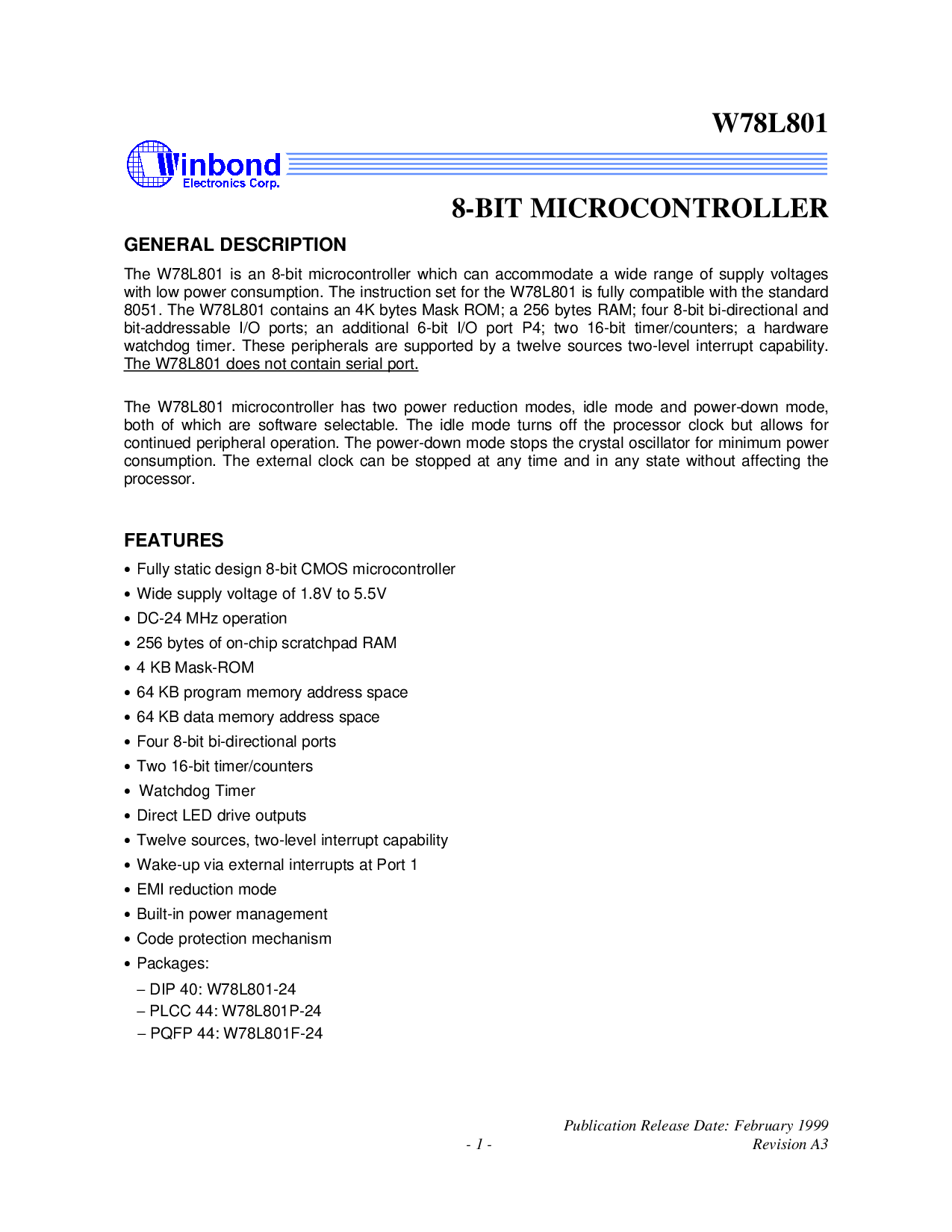 与 低 电源 消费. 这 说明书 设置 用于 这 w78l801 是 完全 兼容 与 这 标准