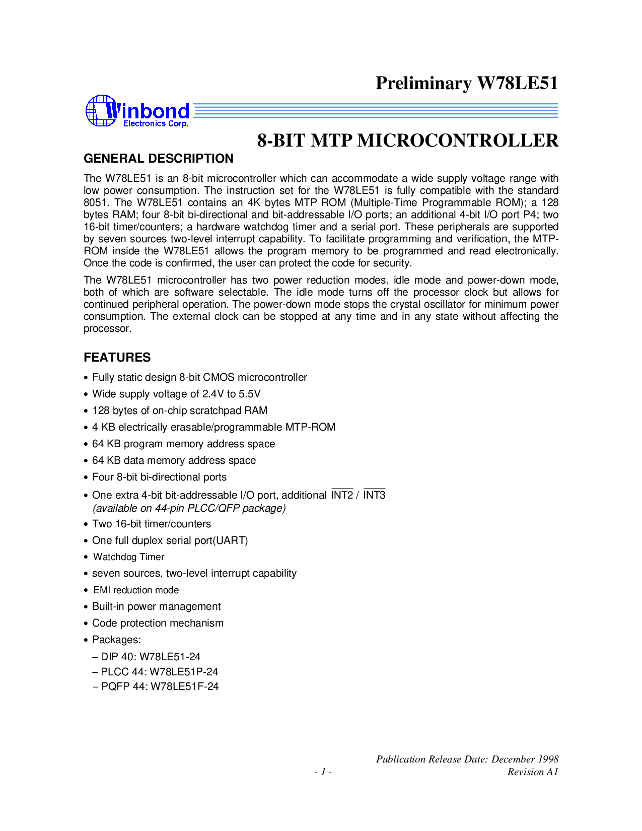 低 电源 消费. 这 说明书 设置 用于 这 w78le51 是 完全 兼容 与 这 标准