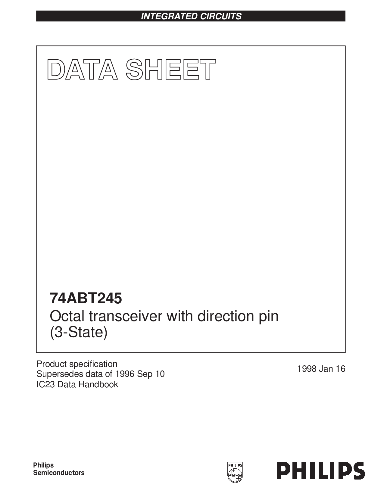 74ABT245 八进制 收发器 与 方向 管脚 (3-州) 产品 规格 取代 数据 的 1996 9月 10 1998 jan 16 综合 电路 ic23 数据 手册 | |