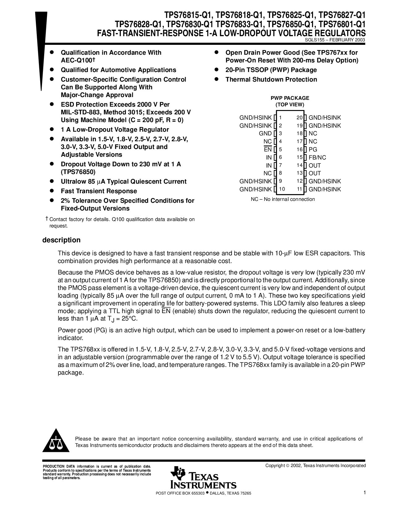 tps76815-q1, tps76818-q1, tps76825-q1, tps76827-q1