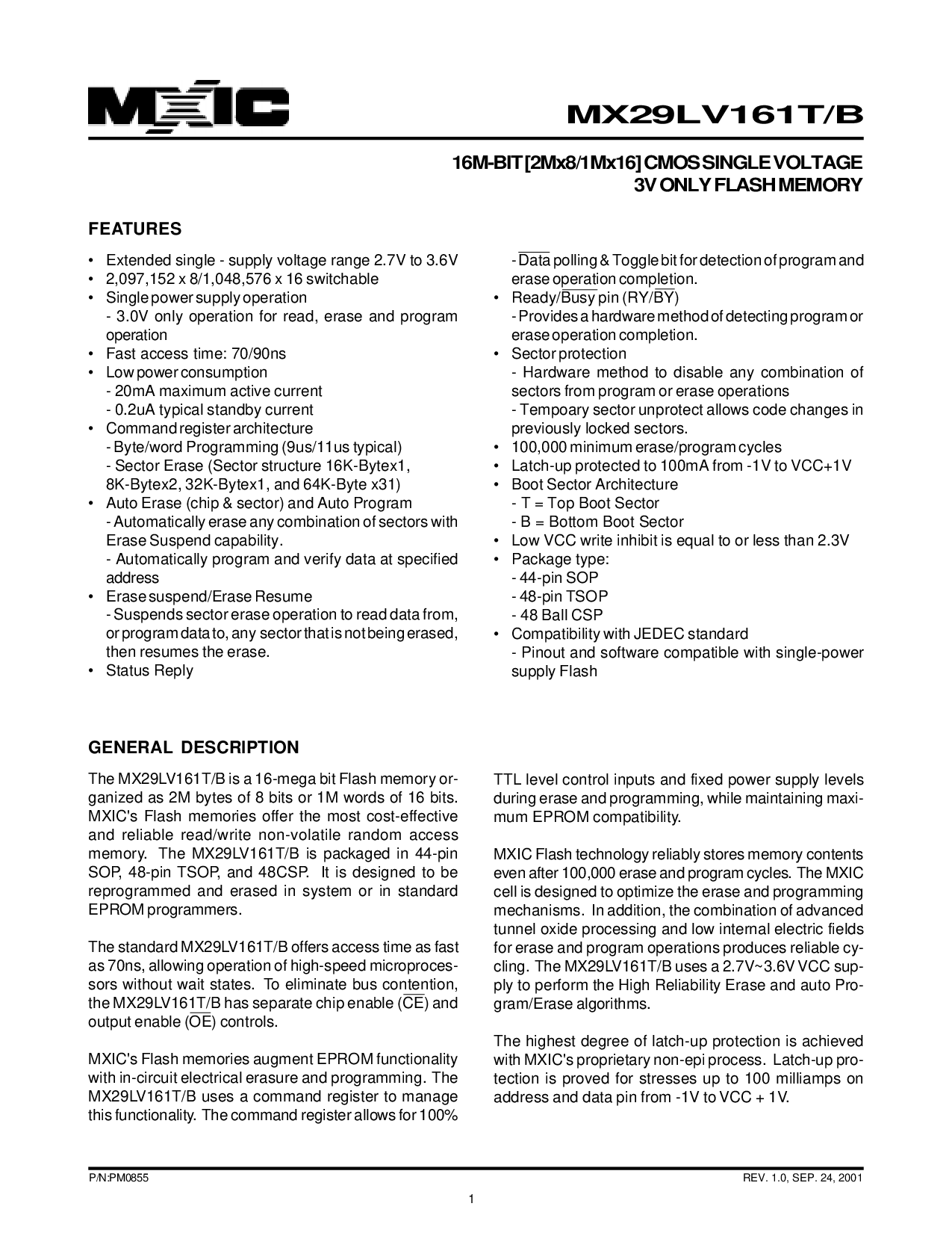 16M-BIT [2Mx8/1Mx16] CMOS SINGLE VOLTAGE 3V ONLY FLASH MEMORY
