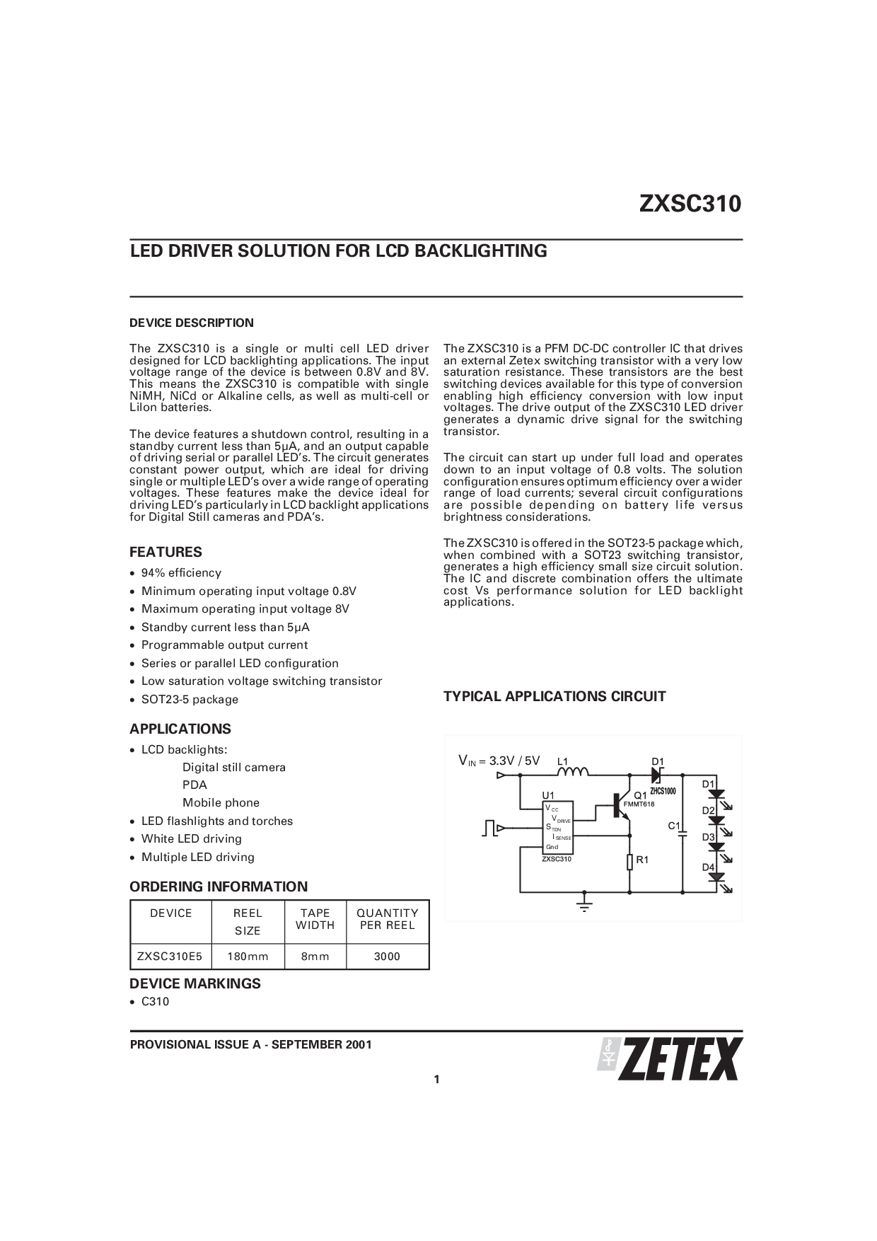 ZXSC310 一个 PFM 直流-直流 控制器 集成电路 驱动器