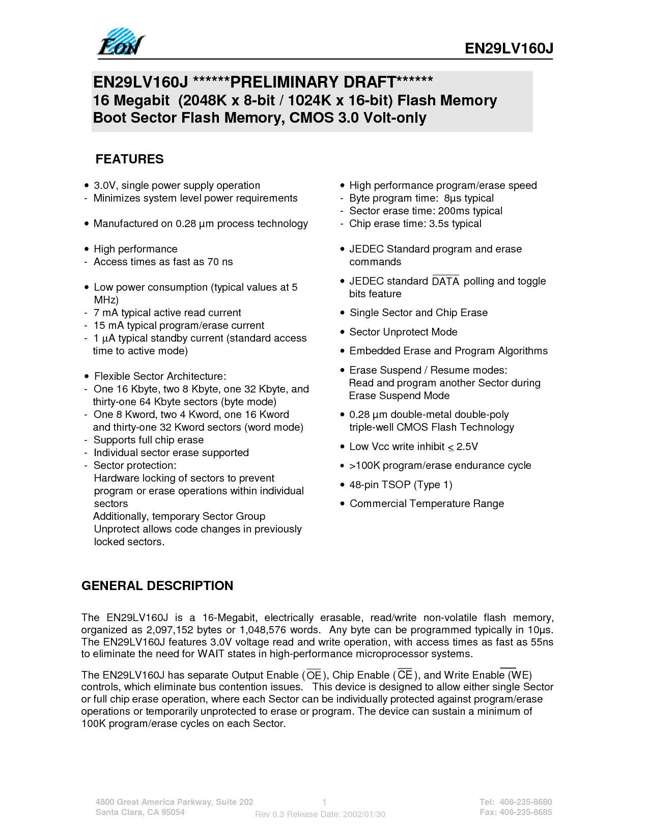 这 en29lv160j 特点 3.0v 电压 阅读 和 写 操作, 与 访问权限 次 作为 快 作为 55ns
