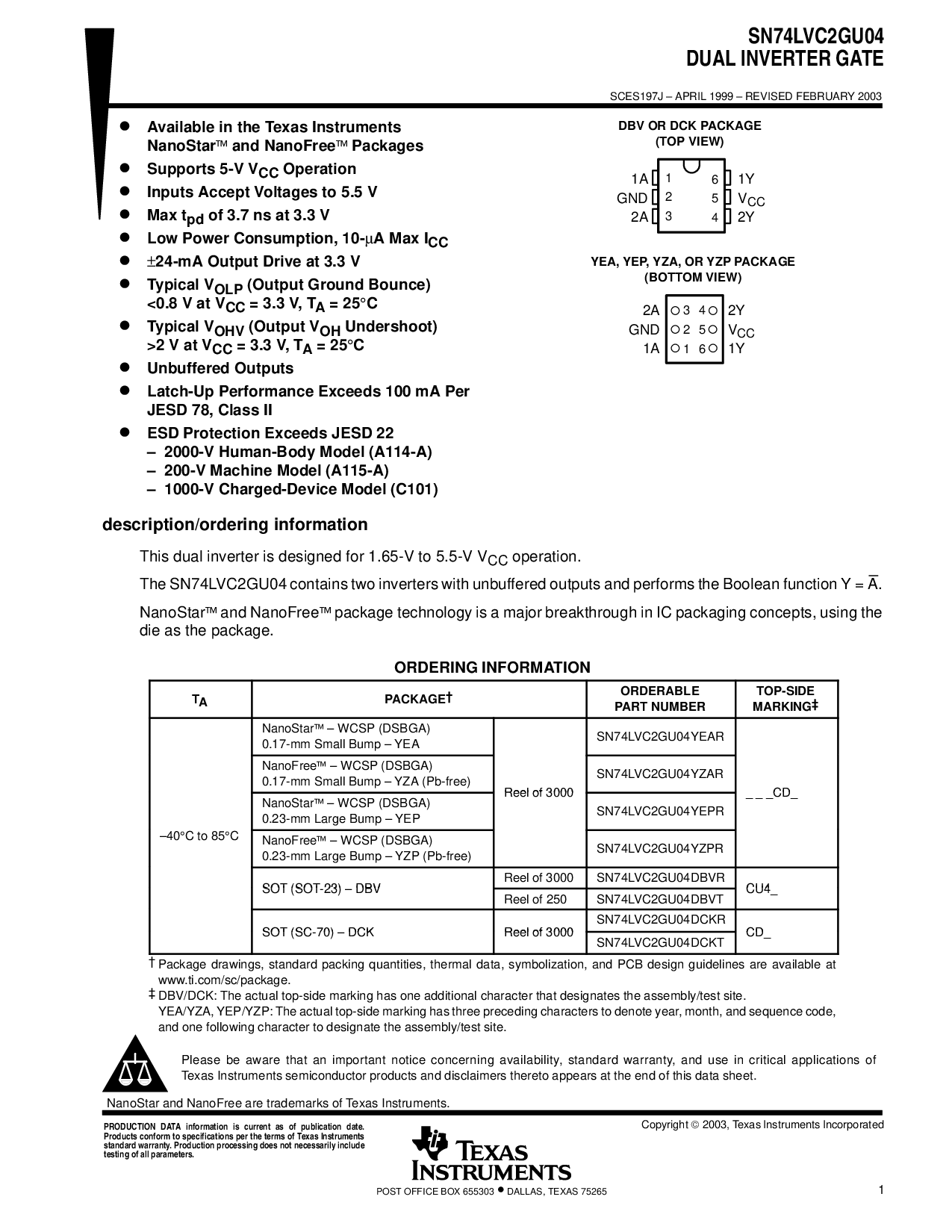这 sn74lvc2gu04 包含 两个 逆变器 与 无缓冲 产出 和 执行 这 boolean 功能 y= 一个