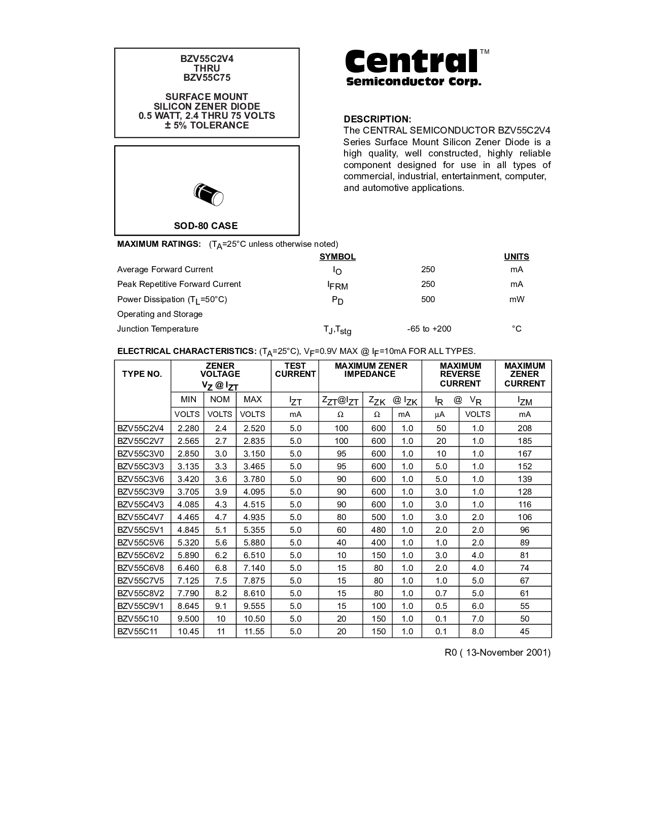 BZV55C7V5 7.125 7.5 7.875 5.0 15 80 1.0 1.0 5.0 67