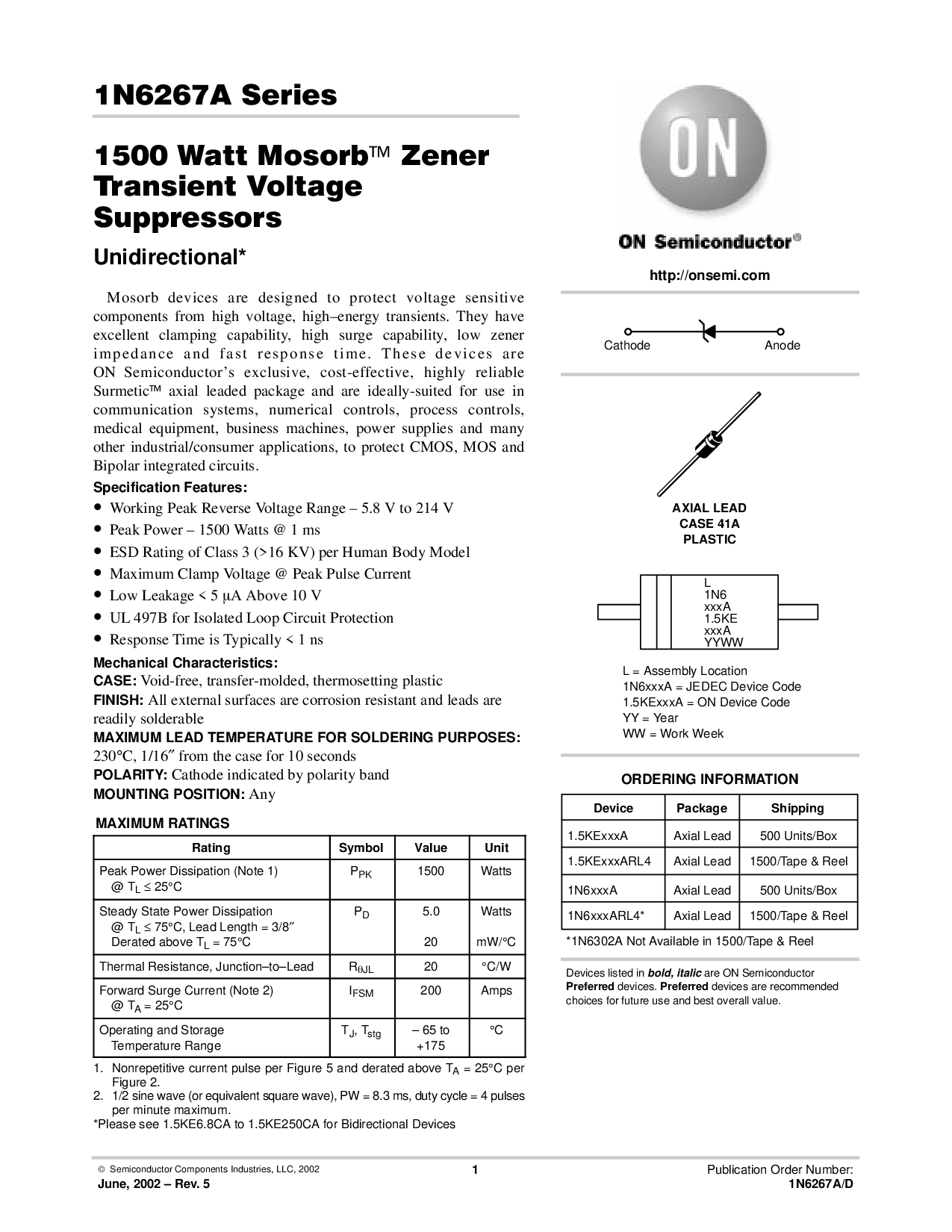 1N6xxxA 轴向 铅 500 单位/框