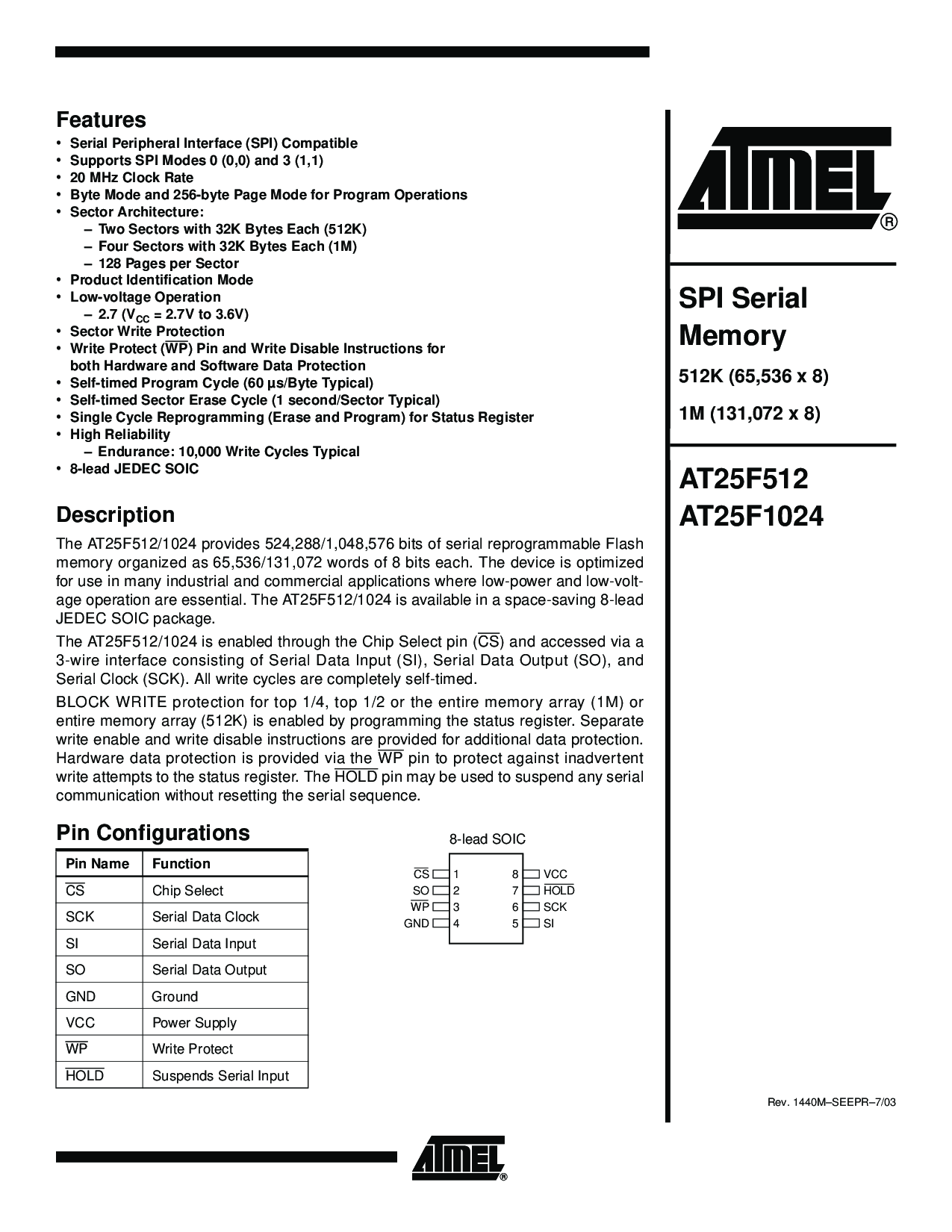 这 at25f512/1024 提供 524,288/1,048,576 比特 的 串行 可重新编程 闪光灯